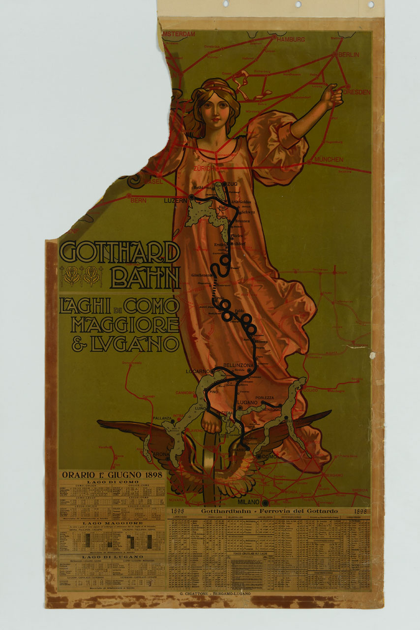 Lettura iconografica: figura femminile; ruota alata; vittoria alata; mappa; carta geografica; cartina ferroviaria; laghi; orario ferroviario. Categoria merceologica/ tipo evento: trasporti; trasporto terrestre; compagnia ferroviaria; trasporti; infrastrutture; linee ferroviarie. Nomi: Gotthardbahn; Ferrovia del Gottardo. Luoghi: Lago di Como; Lago Maggiore; Lago di Lugano; Como; Cadenabbia; Bellagio; Menaggio; Porlezza; Tremezzina; Cantù; Camerlata; Lecco; Colico; Varenna; Novara; Arona; Pello; Alzo; Verbano-Cusio-Ossola; Verbania; Pallanza; Stresa; Isola Bella; Baveno; Intra; Trecate; Galliate; Varese; Luino; Laveno; Porto Ceresio; Lavena Ponte Tresa; Maccagno; Pino sulla Sponda del Lago Maggiore; Busto Arsizio; Saronno; Gallarate; Malnate; Vercelli; Varallo; Rocca; Vico; Sondrio; Morbegno; Chiavenna; Mailand; Milano; Gallarate; Cassano d'Adda; Melzo; Limito; Sesto San Giovanni; Bovisa; Rho; Magenta; Vittuone; Legnano; Bergamo; Caravaggio; Verdello; Ponte della Selva; Treviglio; Monza; Usmate Velate; Desio; Seregno; Cesano Maderno; Seveso; Camnago; Venedig; Venezia; Genua; Genova; San Remo; Sanremo; Bordighera; Pisa; Florenz; Firenze; Rom; Roma; Neapel; Napoli; Bologna; Brindisi; Foggia; Turin; Torino; Brescia; Rovato; Svizzera; Canton Ticino; Locarno; Canobbio; Brissago; Menaggio; Lugano; Mendrisio; Capolago; Monte Generoso; Silvaplana; Basel; Basilea; Bern; Berna; Luzern; Lucerna; Art-Goldhau; Zurich; Zurigo; Zug; Zugo; Rigi Kulm; Schwitz; Brunnen; Fluelen; Altdorf; Erstfeld; Amsteg; Goschenen; Airolo; Faido; Biasca; Bellinzona; Giubiasco; Chiasso; Cadenazzo; Magadino; Germania; Berlin; Berlino; Frankfurt; Francoforte; Magdeburg; Magdeburgo; Cassel; Kassel; Hamburg; Amburgo; Bremen; Brema; Hannover; Heidelberg; Carlsruhe; Karlsruhe; Coln; Koln; Colonia; Mainz; München; Monaco di Baviera; Regensburg; Hof; Stuttgard; Stoccarda; Würzburg; Bebra; Neudietendorf; Leipzig; Lipsia; Halle; Saale; Nordhausen; Eichenberg; Dresden; Dresda; Uelzen; Osnabück; Münster; Francia