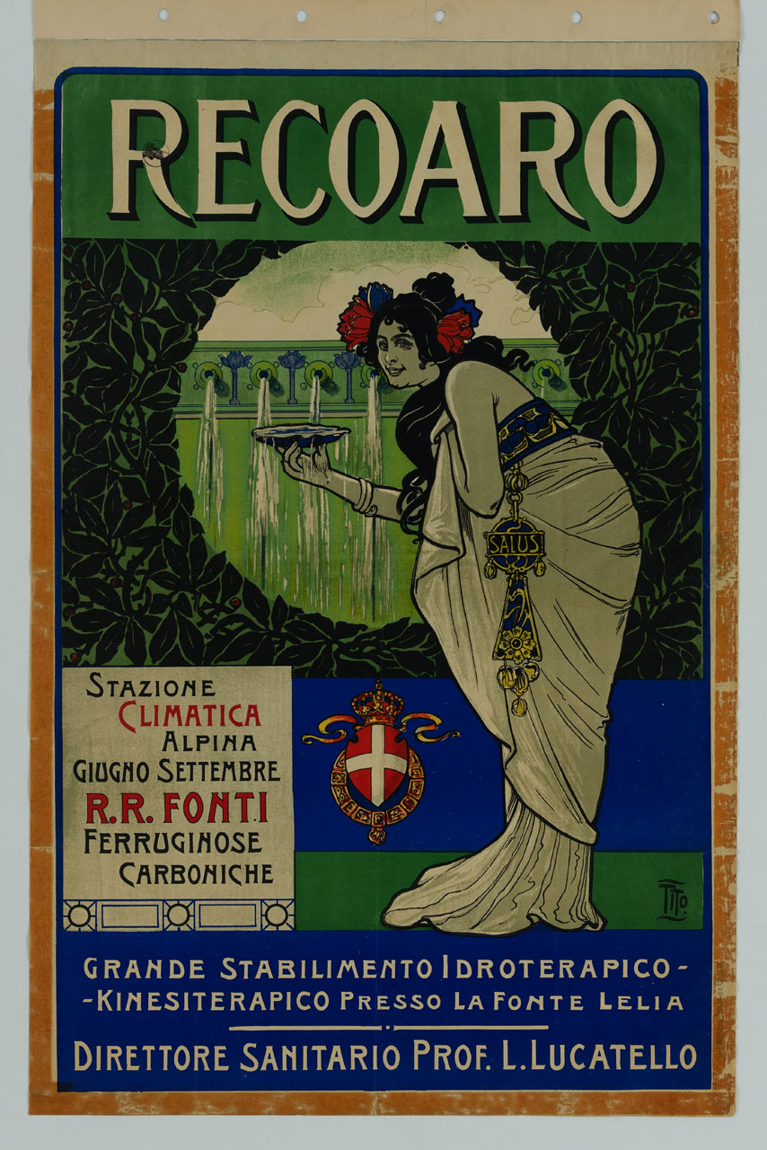 Lettura iconografica: figura femminile; peplo; acqua; fonte termale; foglie. Categoria merceologica/ tipo evento: turismo; terme; strutture di cura. Nomi: Regie Fonti ferruginose carboniche; Grande Stabilimento Idroterapico - Kinesiterapico; Fonte Lelia; Prof. L. Lucatello. Luoghi: Vicenza; Recoaro