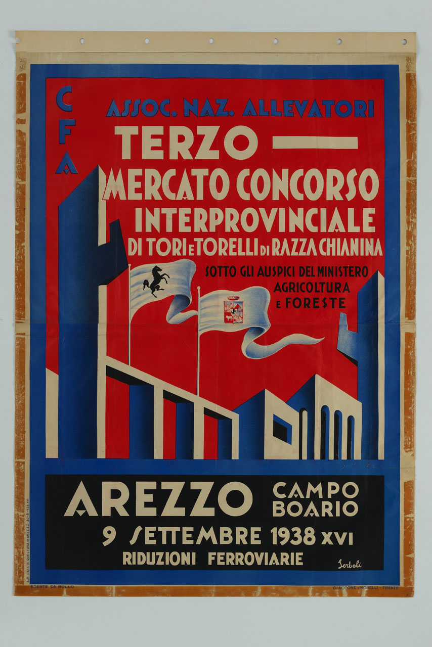 Lettura iconografica: edifici; archi; simboli; fasci littori; bandiere. Categoria merceologica/ tipo evento: amministrazione pubblica; enti locali; amministrazione provinciale; amministrazione comunale; amministrazione centrale; Ministero Agricoltura e Foreste; patrocinio; allevamento; bovini; mostre mercato; concorsi; sindacato; corporazioni; associazioni economiche; riduzioni ferroviarie. Nomi: CFA; Confederazione Fascista degli Agricoltori; Associazione Nazionale Allevatori; Terzo Mercato Concorso Interprovinciale di tori e torelli di razza chianina; Campo Boario. Luoghi: Arezzo