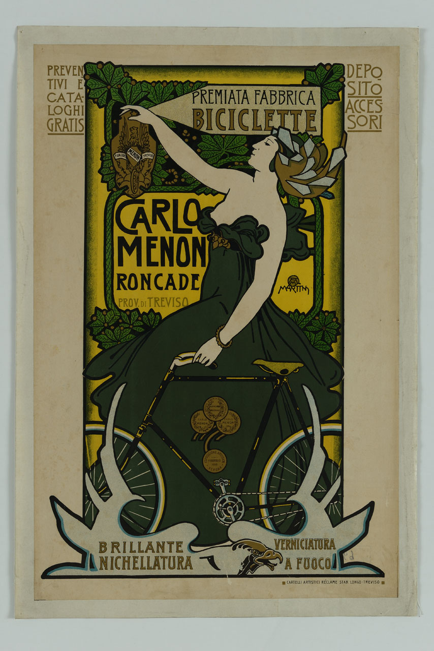 Premiata fabbrica biciclette Carlo Menon. sagoma di aquila ad ali spiegate sovrapposta a una figura di donna con lungo abito verde che tira una bicicletta con la mano destra mentre nella sinistra tiene un emblema sullo sfondo di ghirlande di alloro e fiori