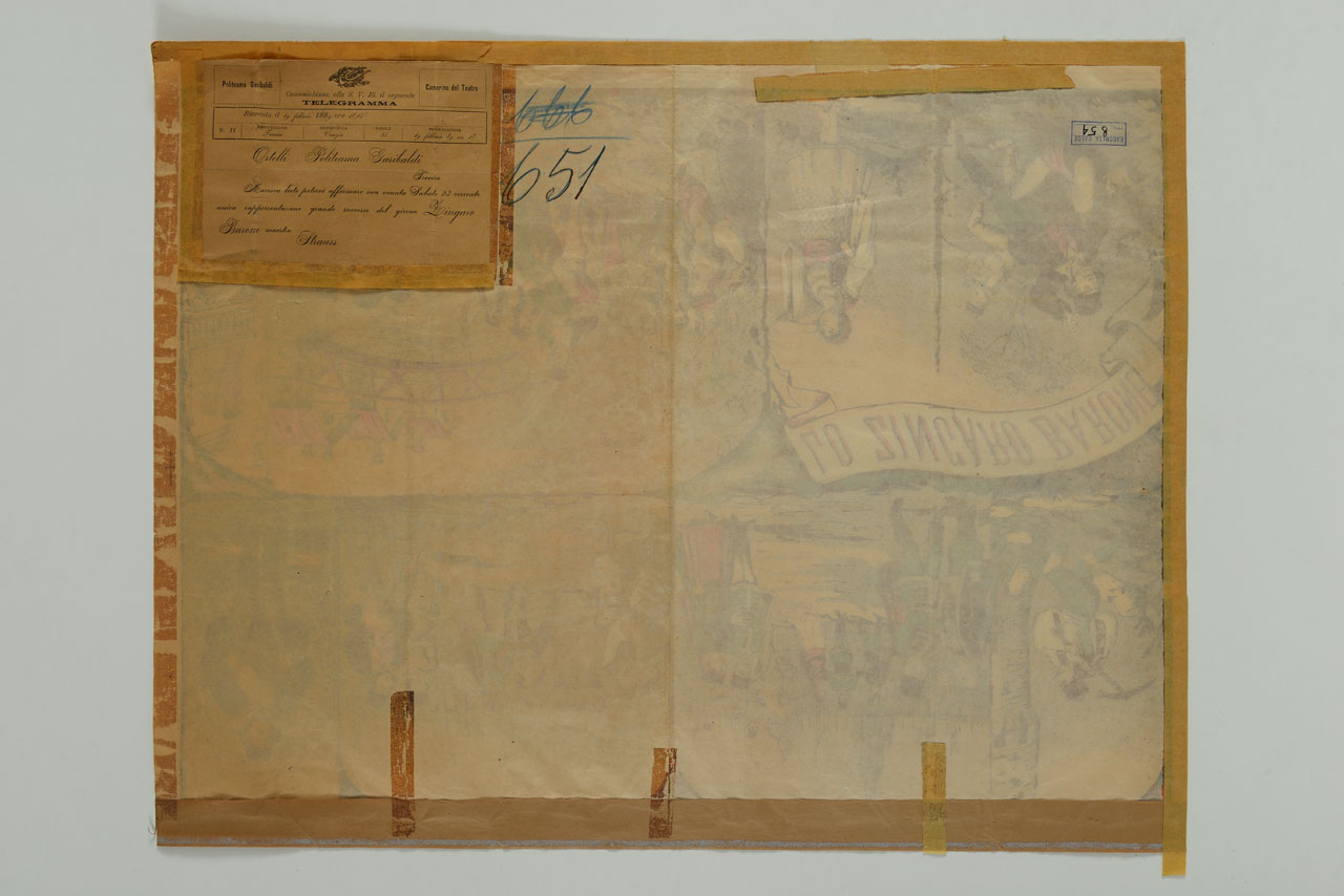 Lettura iconografica: figure maschili; figure femminili; architetture; ponte; alberi. Categoria merceologica/ tipo evento: spettacolo; teatro; musica; operetta; istituzioni culturali. Nomi: Lo zingaro Barone; Johann Strauss; Teatro Garibaldi; Politeama Garibaldi; Camerino del Teatro; Venezia; Ortelli; Maresca. Luoghi: Treviso