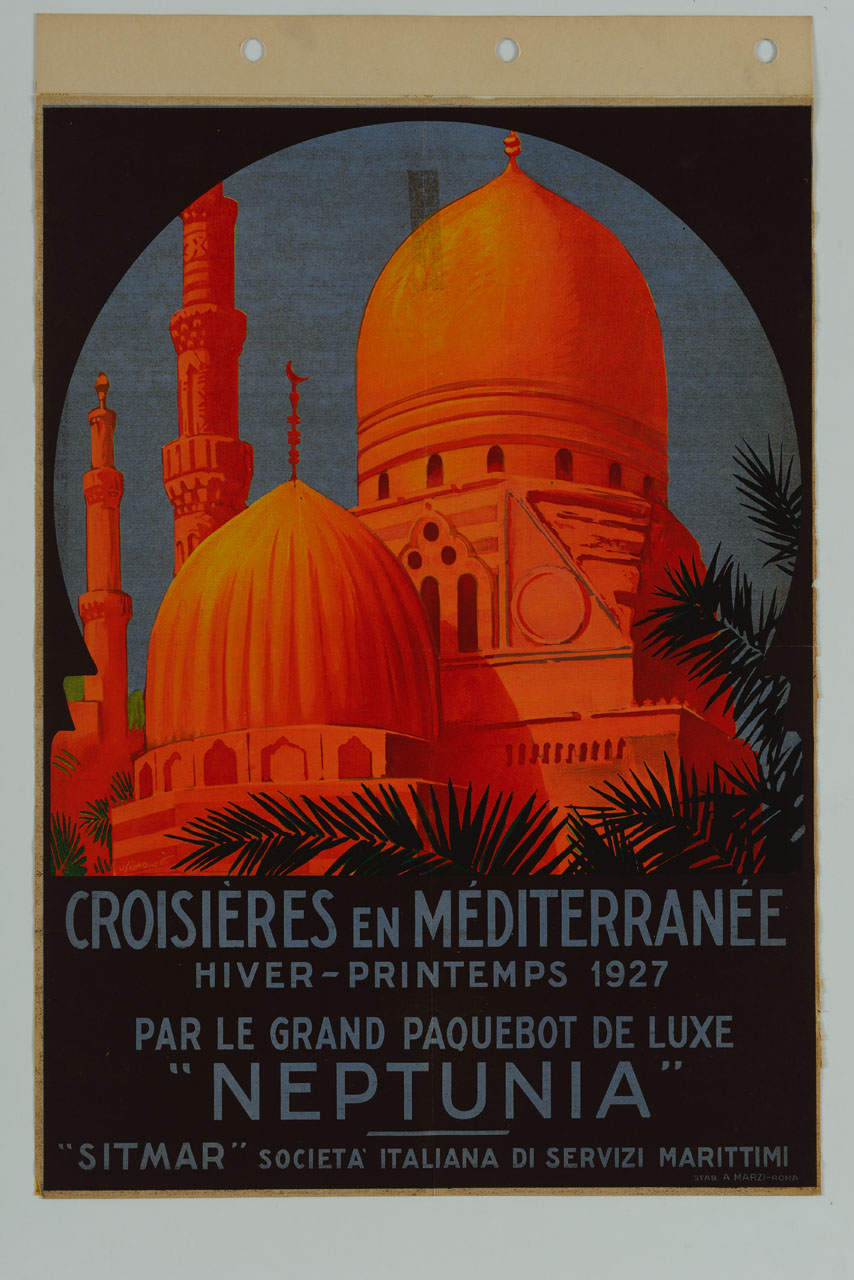 Lettura iconografica: veduta; architetture; cupole; minareti; alberi; cielo; cornice; arco arabo. Categoria merceologica/ tipo evento: turismo; crociera; trasporti; trasporto marittimo; compagnia di navigazione. Nomi: Mediterraneo; Neptunia; Sitmar; Società Italiana di Servizi Marittimi