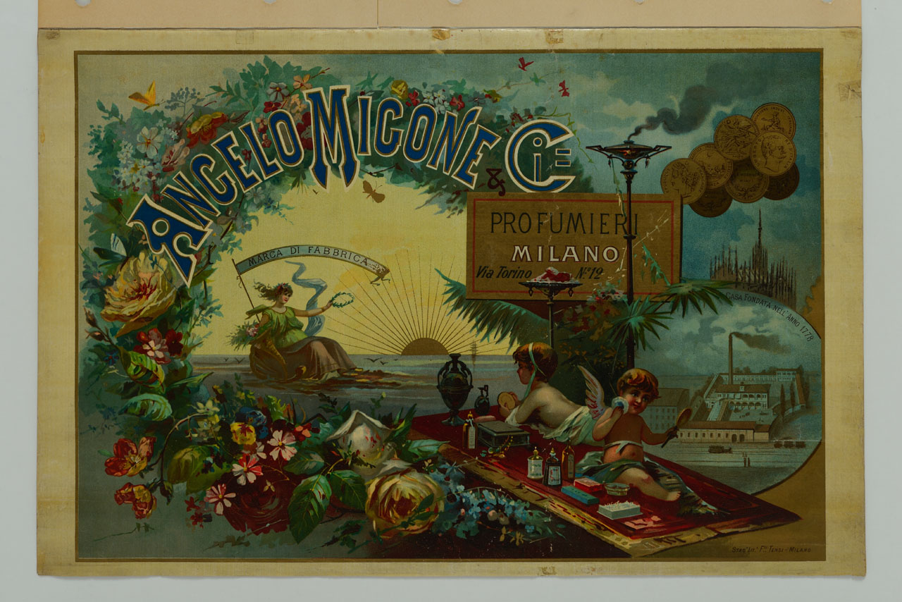 Angelo Migone profumieri Milano. ghirlanda di fiori racchiude angeli seduti su un tappeto con bottiglie di profumo, cipria e gioielli, figura femminile seduta in mezzo al mare con sole sullo sfondo e fabbrica con alta ciminiera fumante
