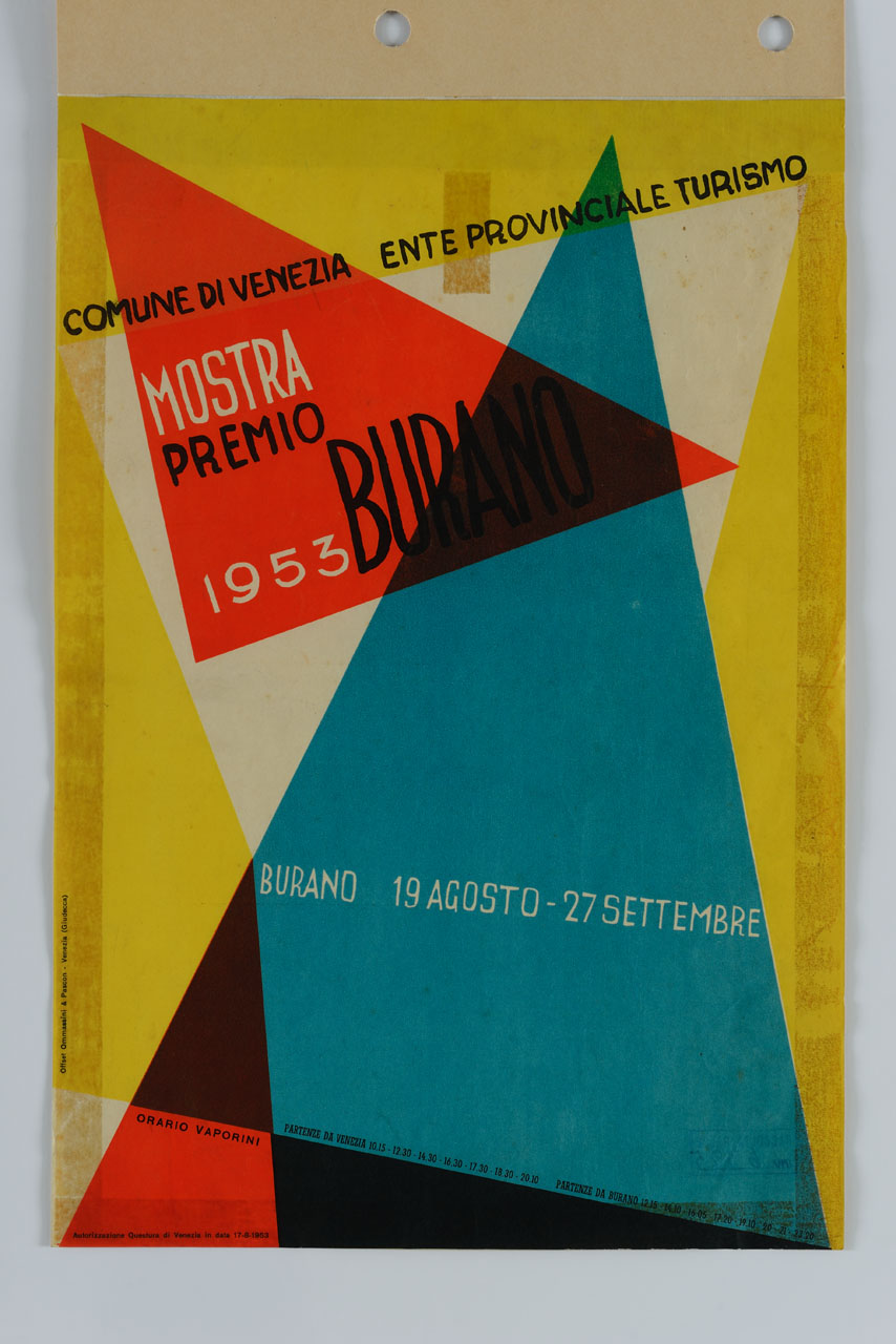 Lettura iconografica: triangoli. Categoria merceologica/ tipo evento: manifestazioni culturali; mostre; mostra d'arte; pittura; concorsi; premio di pittura. Nomi: Premio Burano. Luoghi: Venezia; Burano