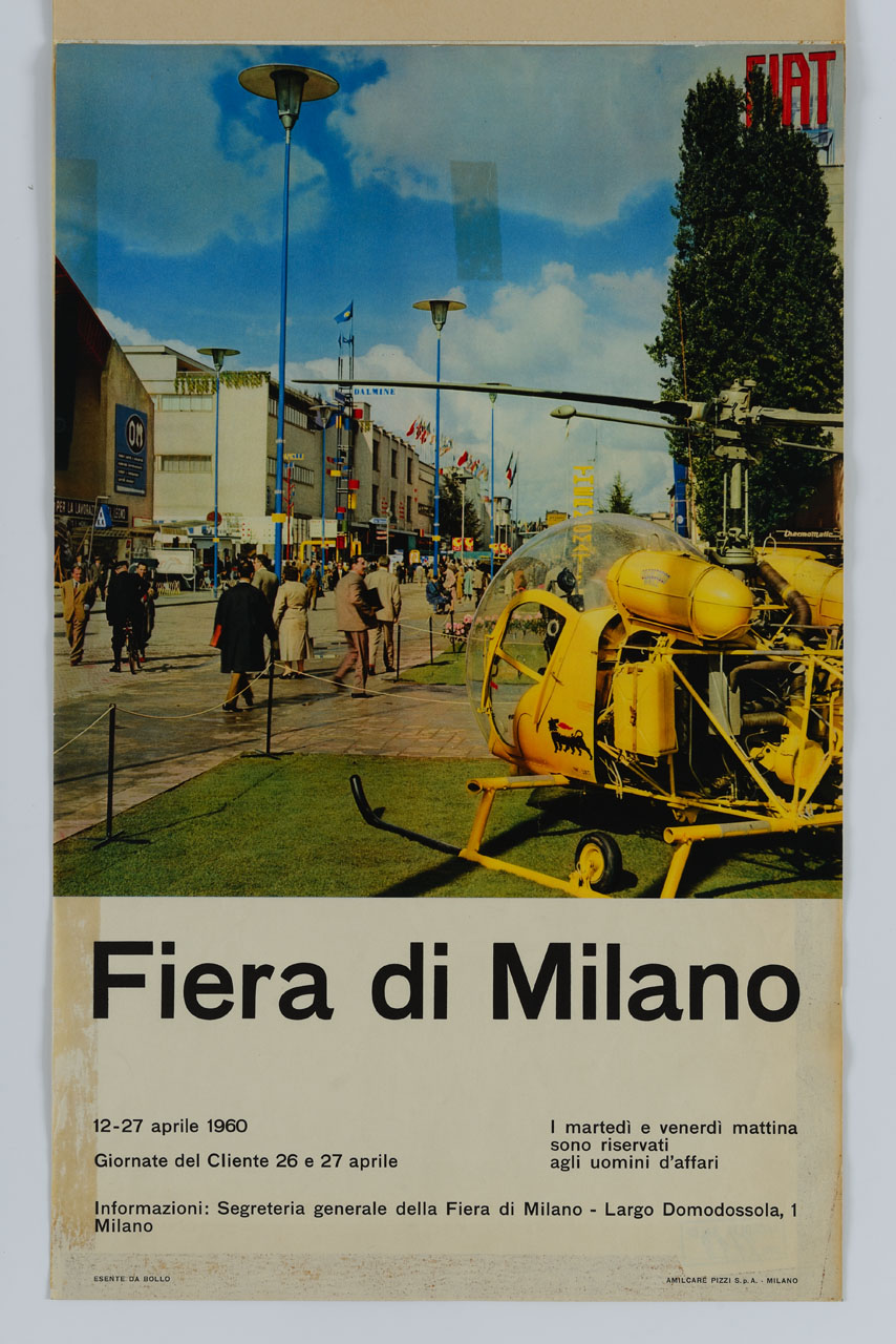 Lettura iconografica: figure maschili; figure femminili; facciata del palazzo delle Nazioni; bandiere; sculture; elicottero. Categoria merceologica/ tipo evento: commercio; industria; artigianato; agricoltura; fiere; industria petrolifera; carburanti; benzina. Nomi: Fiera campionaria di Milano; Eni. Luoghi: Milano