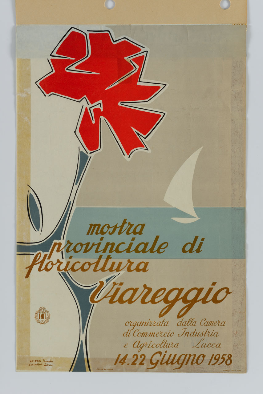 Lettura iconografica: fiore; mare. Categoria merceologica/ tipo evento: commercio; mostre mercato; fiori. Nomi: Mostra provinciale di floricoltura; Camera di Commercio Industria e Agricoltura; ENIT; Ente Nazionale per l’incremento delle Industrie Turistiche. Luoghi: Lucca; Viareggio