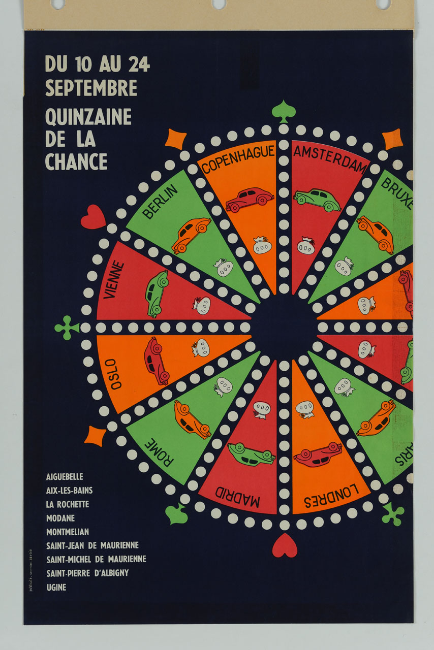 Lettura iconografica: roulette. Categoria merceologica/ tipo evento: tempo libero; casinò. Nomi: Quinzane de la chance. Luoghi: Francia; Aigubelle; Aix-Les-Bains; La Rochette; Modane; Montmelian; Saint-Jean de Maurienne; Saint-Michel de Maurienne; Saint-Pierre d'Albigny; Ugine