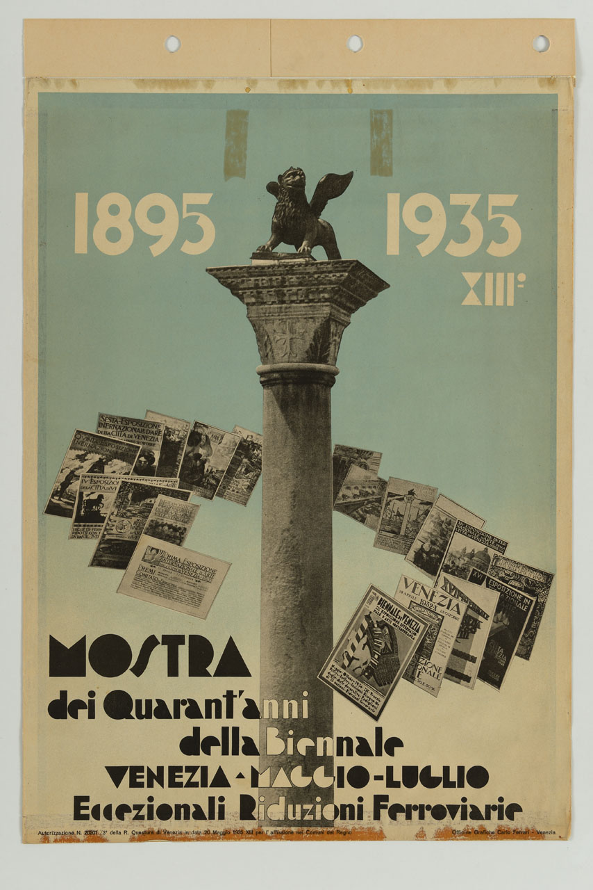 Lettura iconografica: veduta con architettura; Colonna di San Marco; manifesti. Categoria merceologica/ tipo evento: manifestazioni culturali; mostre; mostra d'arte; mostra storica; pittura; scultura; architettura; riduzioni ferroviarie. Nomi: Mostra dei Quarant'anni della Biennale. Luoghi: Venezia