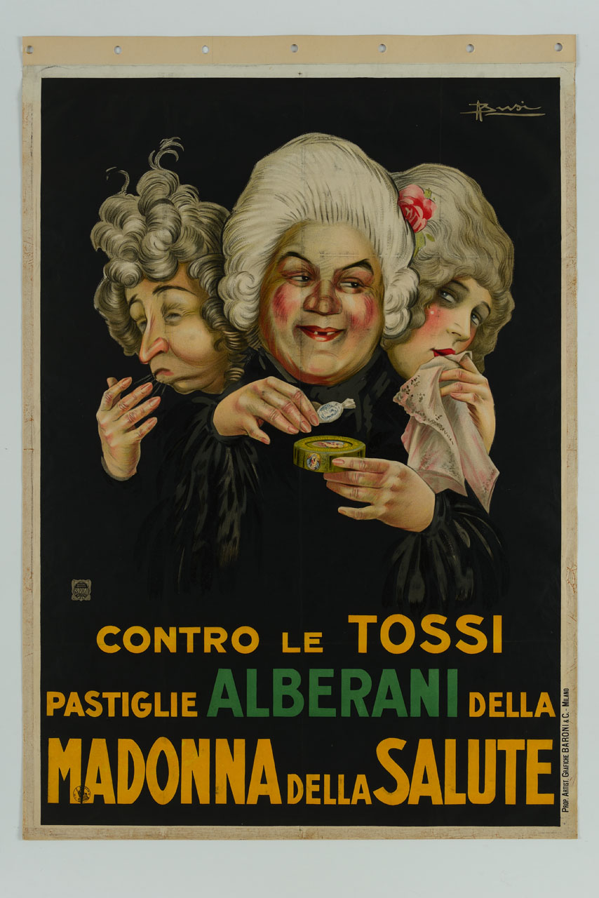 Lettura iconografica: figure femminili; volti; parrucche settecentesche; fazzoletto ricamato; contenitori in latta; confezione di pastiglie; caramella; raffigurazioni sacre; Madonna col Bambino. Categoria merceologica/ tipo evento: industria farmaceutica; preparati farmaceutici; pastiglie per la tosse. Nomi: Stabilimento Chimico Farmaceutico G. Alberani; Pastiglie della Madonna della Salute. Luoghi: Italia; Bologna