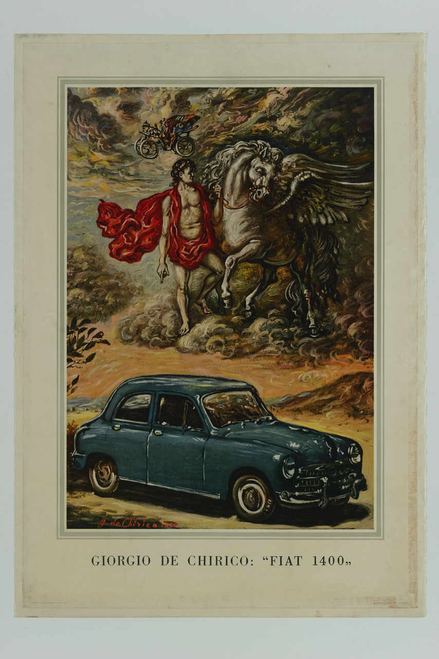 Lettura iconografica: dipinto; automobili; figure mitologiche; cavallo; nuvole. Categoria merceologica/ tipo evento: industria meccanica; mezzi di trasporto; automobile. Nomi: Fiat; Fabbrica Italiana Automobili Torino; Fiat 1400; Fiat 3/12hp; Giorgio De Chirico; belelrofonte; pegaso; Chimera. Luoghi: Torino