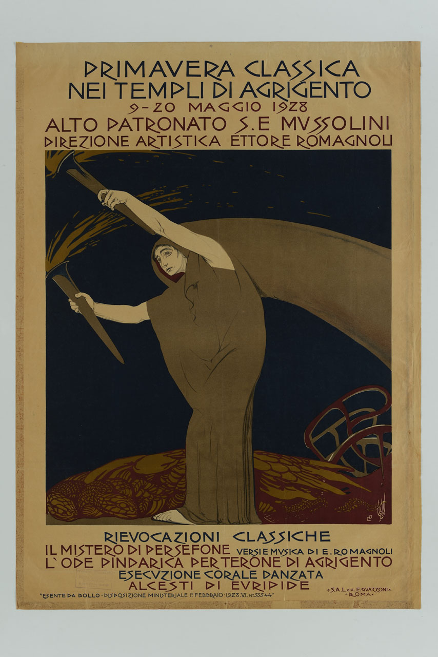 Lettura iconografica: figura femminile; mantello; torce; serpenti stilizzati; notte. Categoria merceologica/ tipo evento: spettacolo; teatro; tragedia. Nomi: Primavera Classica nei Templi di Agrigento; Valle dei Templi; Benito Mussolini; Ettore Romagnoli; Il mistero di Persefone; Ettore Romagnoli; Ode Pindarica per Terone di Agrigento; Alcesti; Euripide; Eraclea Minoa. Luoghi: Cattolica Eraclea; Agrigento