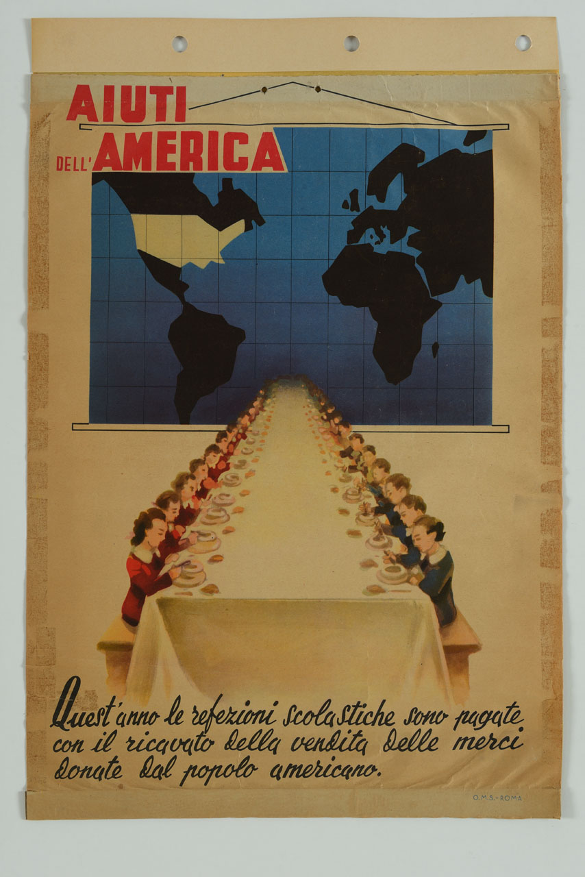 Lettura iconografica: tavola; mensa; bambini, divisa rossa; divisa blu, planisfero; mensa; tricolore americano. Categoria merceologica/ tipo evento: informazione e comunicazione; propaganda. Nomi: ERP; European Recovery Program; Piano Marshall; Geroge Marshall; OMS; Organizzazione Mondiale della Sanità