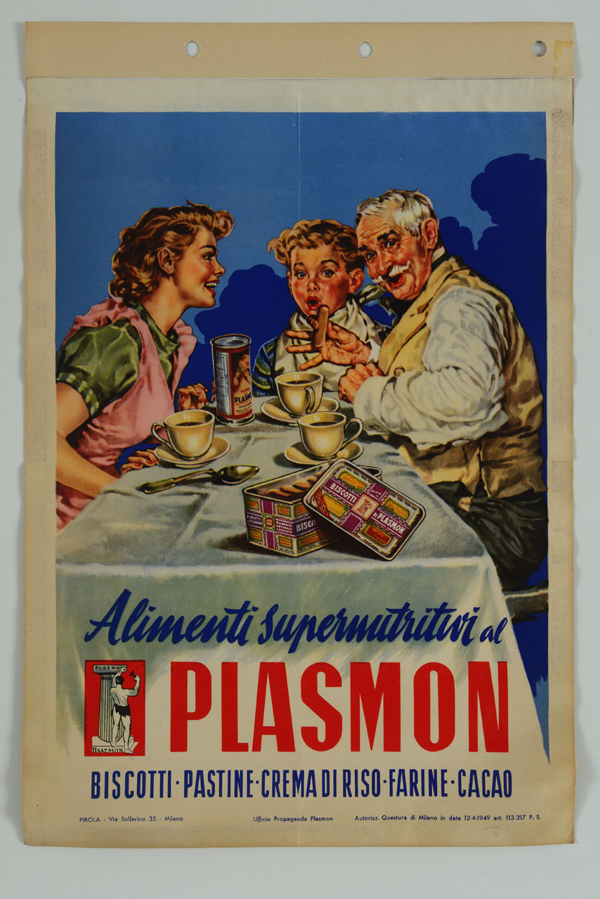 Lettura iconografica: figura maschile; figura femminile; grembiule; gilet; baffi; tovagliolo; bambino; tavola; tazzine; biscotti; scatola di biscotti; tovaglia; cucchiaio; caffè. Categoria merceologica/ tipo evento: industria alimentare; alimenti per bambini; alimenti ricostituenti; biscotti; cacao; farine; crema di riso; pastine. Nomi: Biscotti al Plamon; dottor Cesare Scotti; Sindacato Italiano del Plasmon; Società del Plasmon; alimenti supernutritivi al Plasmon; Plasmon Dietetici Alimentari Srl. Luoghi: Milano