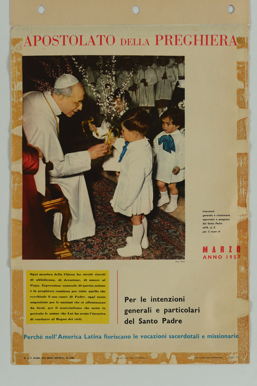 Apostolato della preghiera. Per le intenzioni generali e particolari del Santo Padre. bambini in fila donano rami fioriti a papa Pio XII