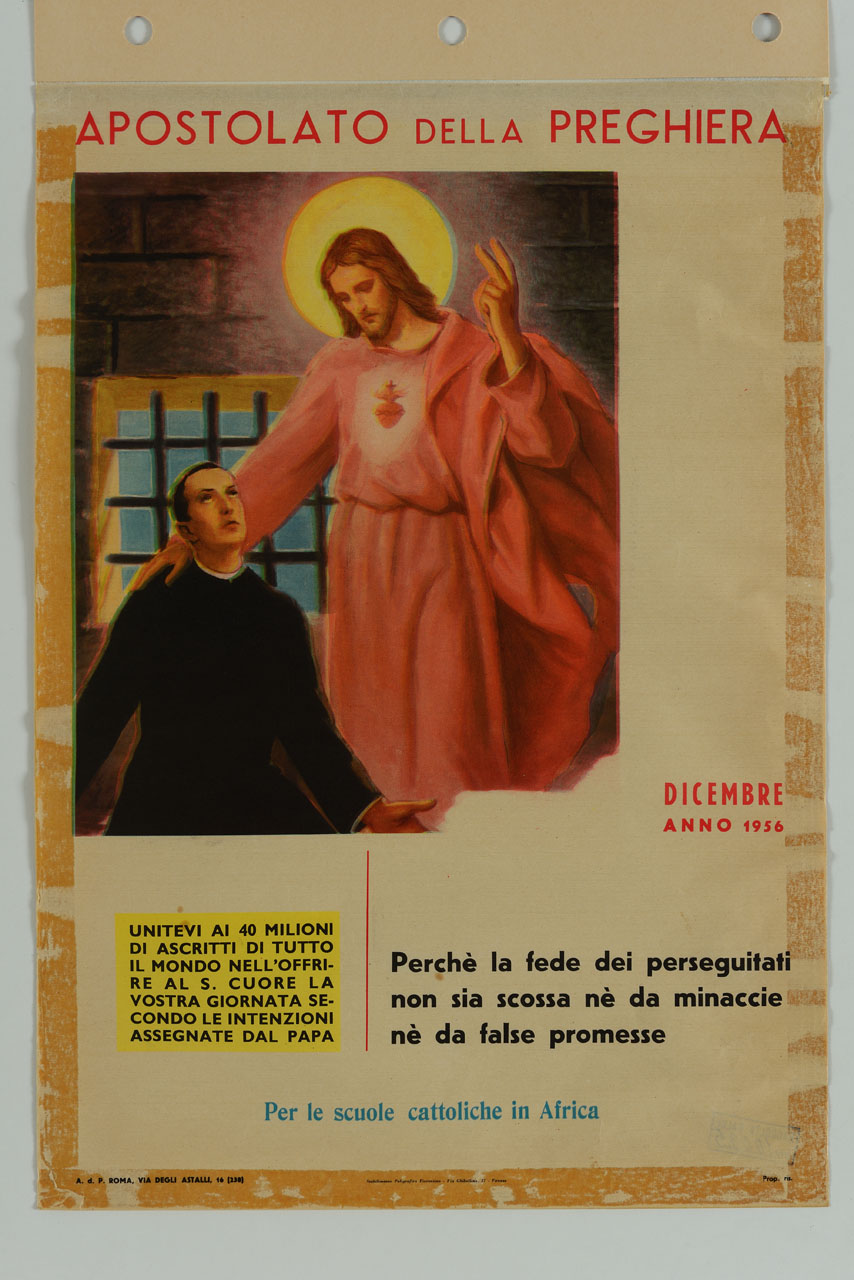 Lettura iconografica: figure maschili; abito talare; cuore; corona di spine; sangue; croce; stimmate; aureola; finestra con inferriata. Categoria merceologica/ tipo evento: religione cattolica; apostolato; istruzione. Nomi: Santo Padre; Pio XII; Eugenio Maria Giuseppe Giovanni Pacelli; Papa; Sacro Cuore; Gesù. Luoghi: Africa; Città del Vaticano