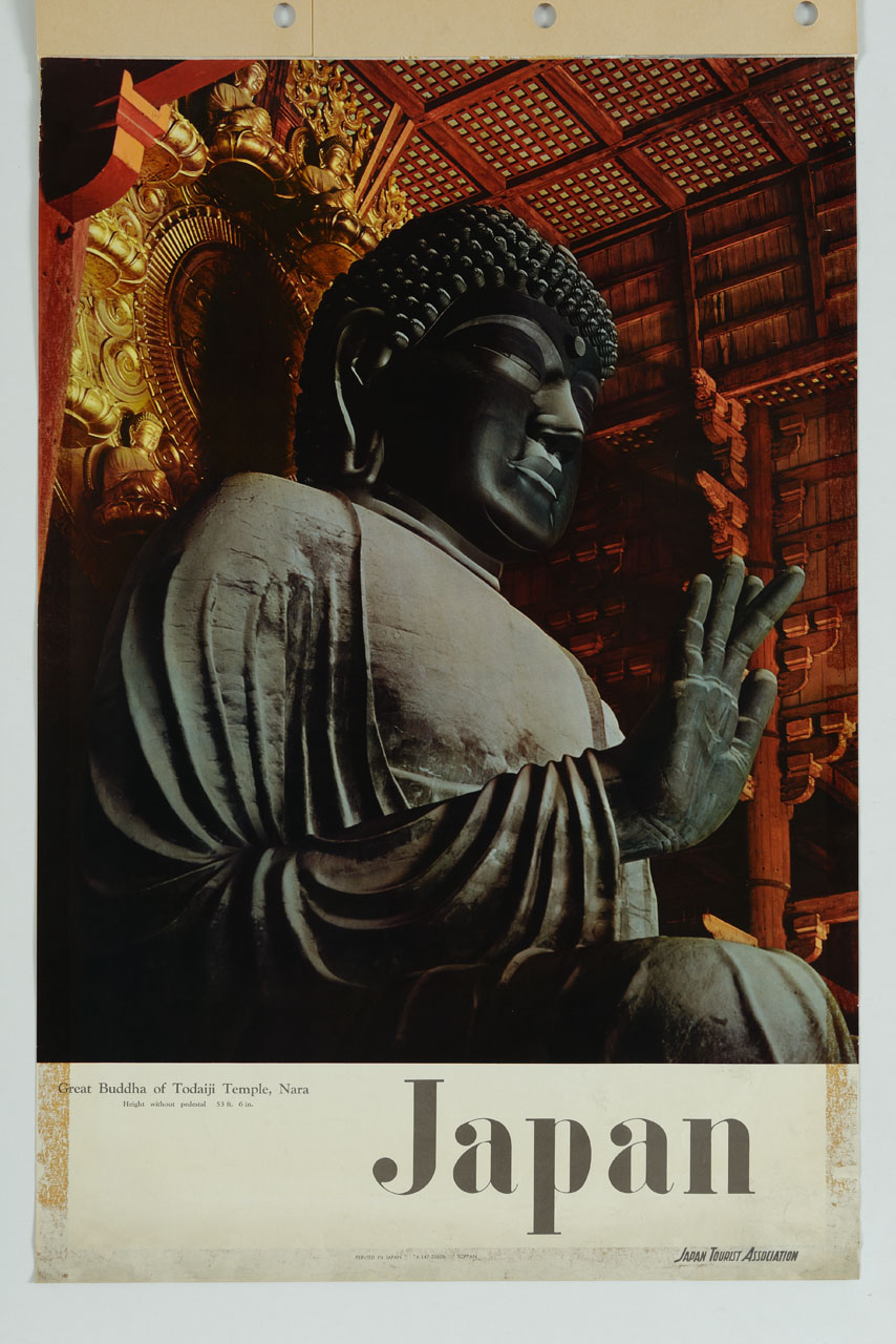 Lettura iconografica: interno di tempio; statua. Categoria merceologica/ tipo evento: turismo; associazioni di promozione turistica. Nomi: Tōdai-ji Temple; Great Buddha; Daibutsu; Great Buddha Hall; Daibutsuden; Japan Tourist Association. Luoghi: Giappone; Nara