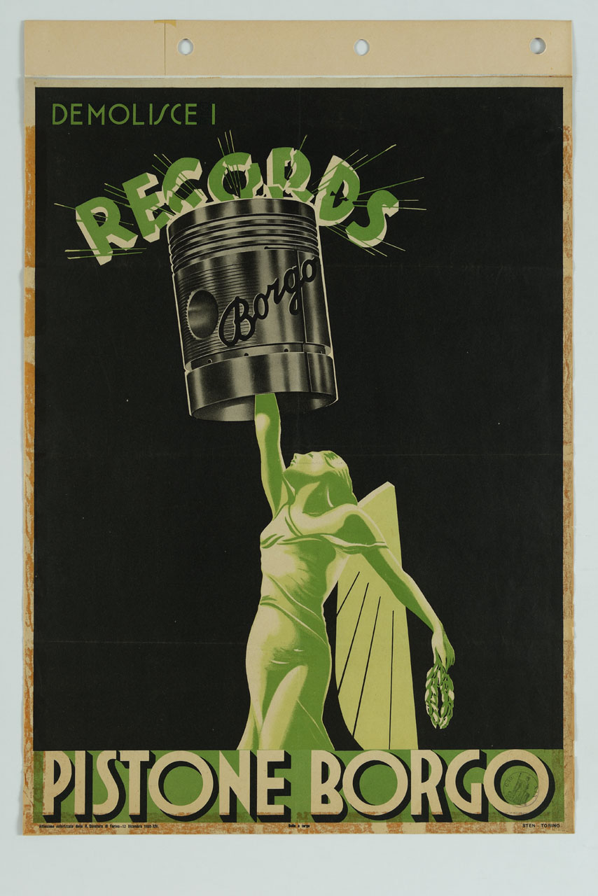 Pistone Borgo. statua alata della Vittoria tiene alzato con braccio destro un pistone