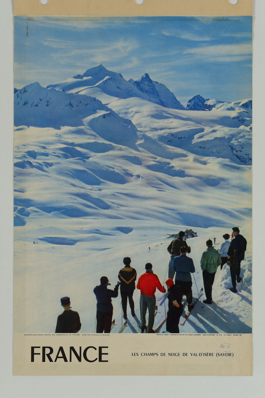 Lettura iconografica: figure maschili; figure femminili; montagne; neve; scii; sole; giacche; berretti. Categoria merceologica/ tipo evento: informazione e comunicazione; editoria; carta geografica; tempo libero; turismo; enti di promozione turistica. Nomi: Ministère des travaux publics, des transports et du tourisme; Direction générale du tourisme. Luoghi: Val d’Isère; Savoia; Rodano; Alpi; Francia