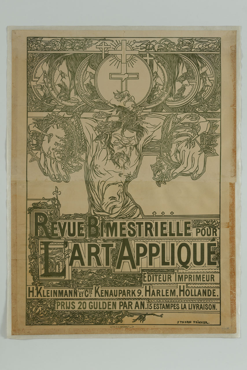 Lettura iconografica: figura maschile; Cristo crocifisso; croce; medaglie; volti maschili. Categoria merceologica/ tipo evento: informazione e comunicazione; editoria; periodico bimestrale; arte applicata. Nomi: Revue Bimestrelle pour l'Art Appliqué; Editeur Imprimeur H. Kleinmann et C.ie. Luoghi: Paesi Bassi; Hollande; Olanda Settentrionale; Haarlem