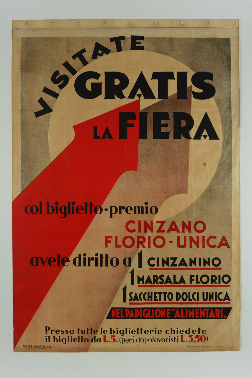Lettura iconografica: freccia; figura geometrica; cerchio. Categoria merceologica/ tipo evento: commercio; industria; artigianato; agricoltura; fiere; associazioni culturali. Nomi: Cinzano; Florio; Unica; Cinzanino; Marsala Florio; Dolci Unica; Padiglione Alimentari; Dopolavoristi; OND; Opera Nazionale Dopolavoro. Luoghi: Torino