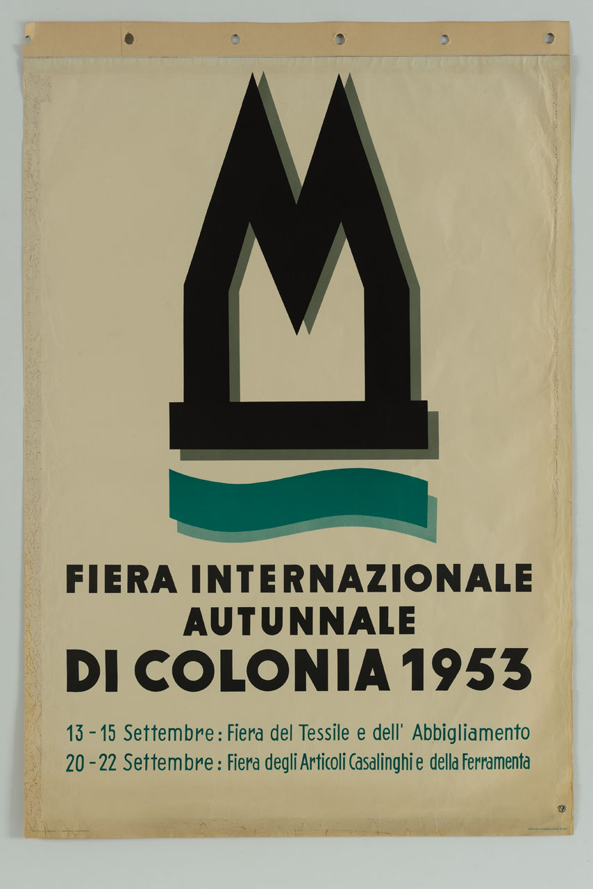 Lettura iconografica: scritte; logo della fiera di Colonia; sagoma stilizzata del Duomo di Colonia. Categoria merceologica/ tipo evento: commercio; industria tessile; abbigliamento; industria manifatturiera; articoli casalinghi; industria metallurgica; ferramenta; fiere; associazioni economiche. Nomi: Fiera internazionale autunnale di Colonia 1953; Fiera del Tessile e dell’Abbigliamento; Fiera degli Articoli Casalinghi e della Ferramenta; UFI; Union des Foires Internationales. Luoghi: Germania; Colonia