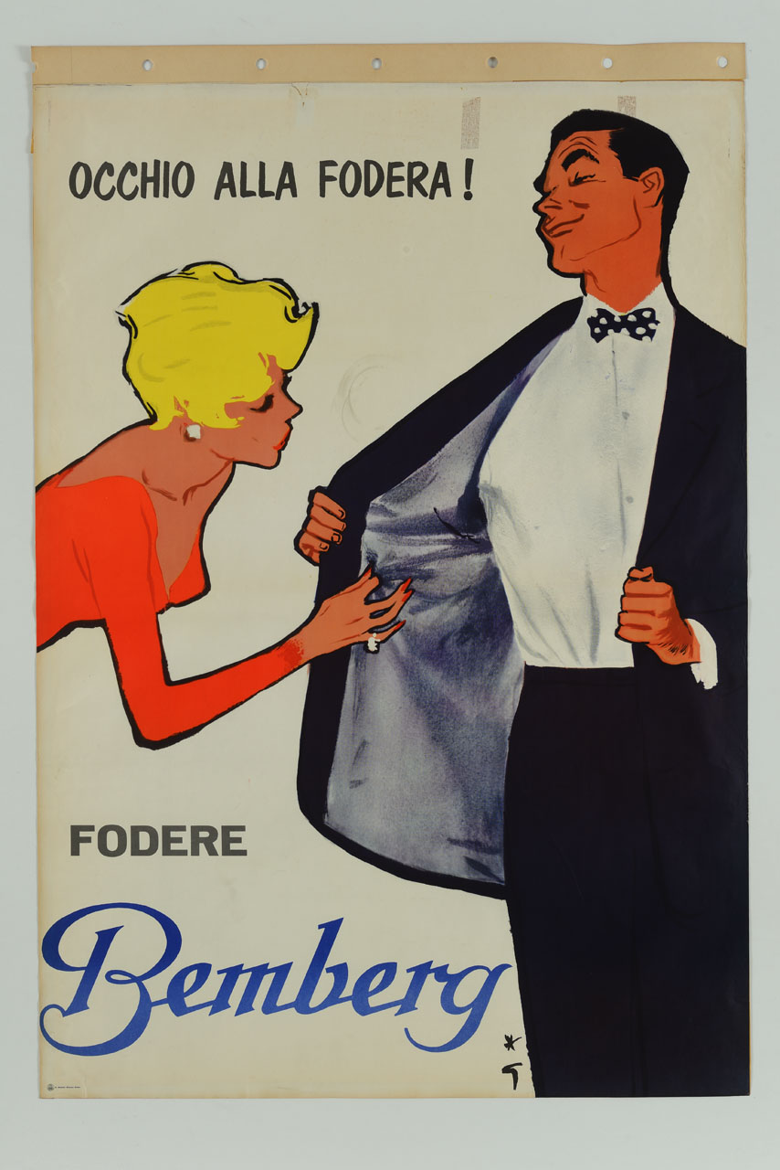 Lettura iconografica: figura femminile; figura maschile; giacca; fodera. Categoria merceologica/ tipo evento: industria tessile; tessuti in fibre artificiali e sintetiche; abbigliamento. Nomi: Bemberg. Luoghi: Novara; Gozzano