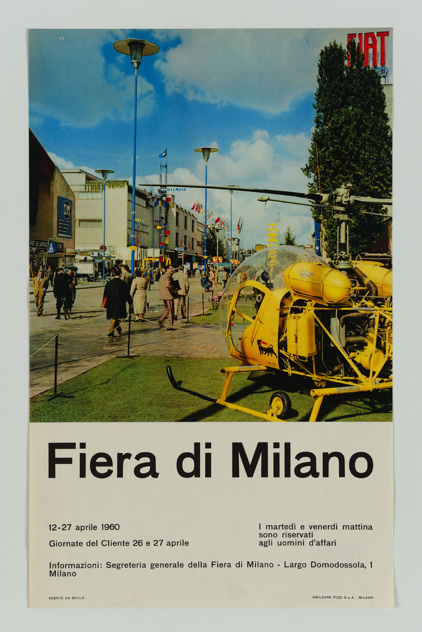 Lettura iconografica: elicottero; figure maschili; figure femminili; architettura; edifici; quartiere fieristico; bandiere. Categoria merceologica/ tipo evento: turismo; commercio; fiere; industria meccanica; industria petrolifera; industria metallurgica. Nomi: Fiera di Milano; Giornate del Cliente; FIAT; Fabbrica Italiana Automobili Torino; AGIP; Azienda Generale Italiana Petroli; Dalmine. Luoghi: Milano
