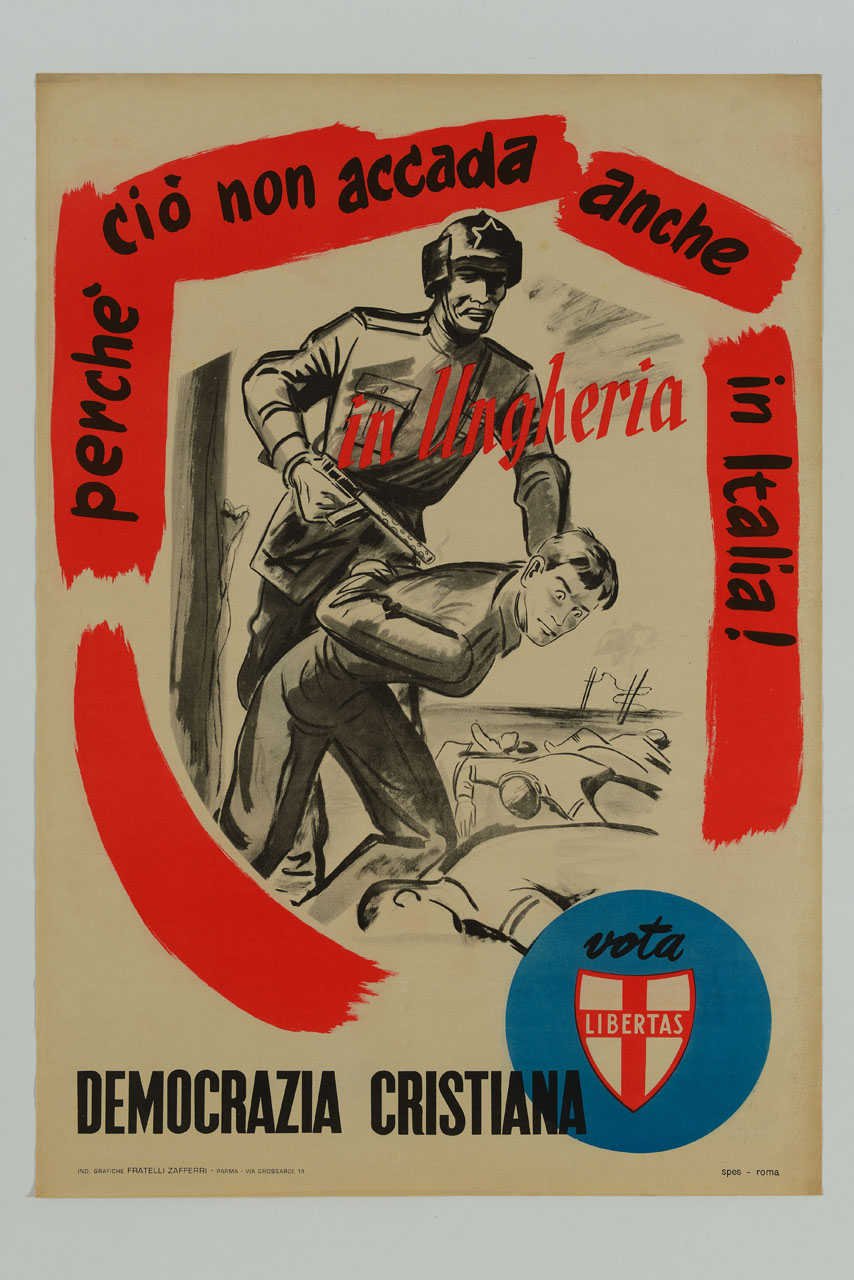 Lettura iconografica: figure maschili; soldato; morti; fucile; strage. Categoria merceologica/ tipo evento: informazione e comunicazione; propaganda elettorale; propaganda anticomunista; politica; partiti politici. Nomi: DC; Democrazia Cristiana. Luoghi: Ungheria; Italia