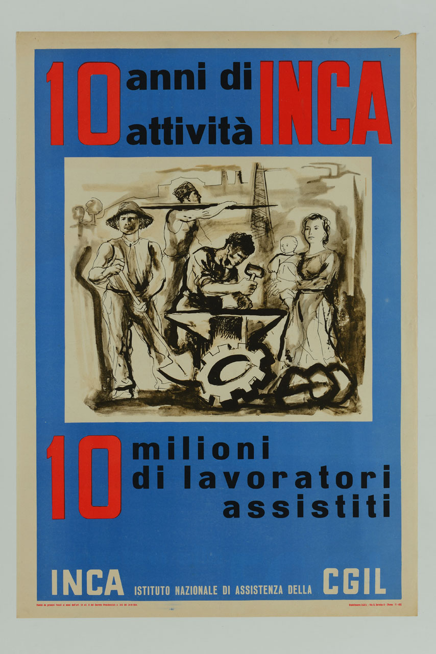 Lettura iconografica: figure maschili; figura femminile; bambino; contadino; operai; incudine; martello; vanga. Categoria merceologica/ tipo evento: sindacato; organizzazioni sindacali. Nomi: Istituto Nazionale Confederale di Assistenza; INCA; Confederazione Generale Italiana Lavoratori; CGIL