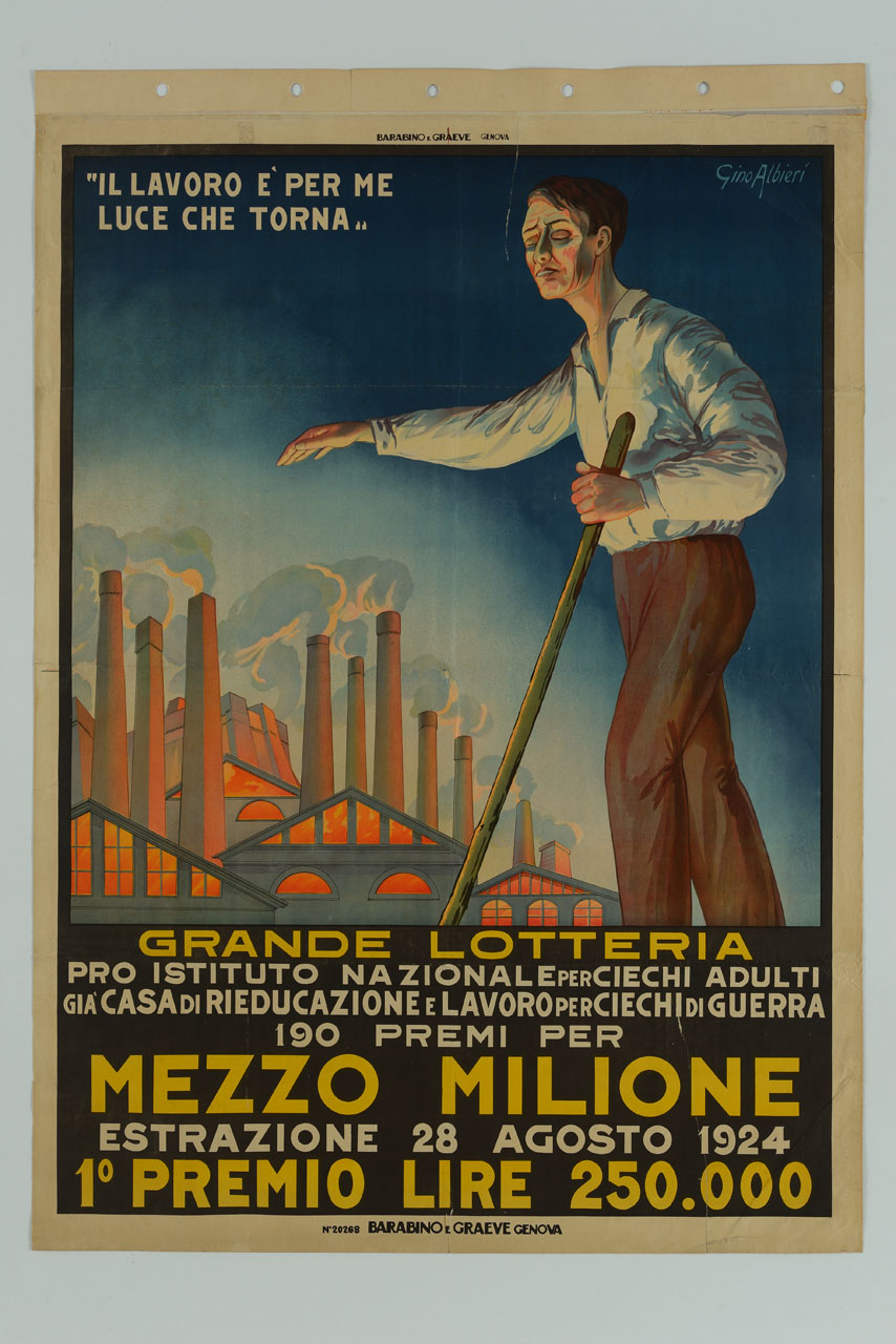 Lettura iconografica: figura maschile; cieco; bastone; industrie; ciminiere. Categoria merceologica/ tipo evento: istruzione; raccolta fondi; tempo libero; lotteria. Nomi: Istituto Nazionale per Ciechi Adulti; Casa di rieducazione e lavoro per i ciechi di guerra. Luoghi: Firenze