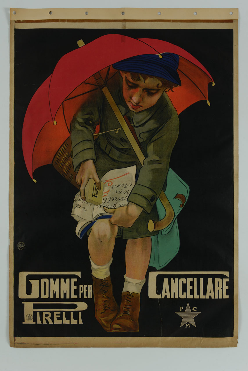Lettura iconografica: figura maschile; bambino; scolaro; ombrello; quaderno; gomma; cartella; cestino. Categoria merceologica/ tipo evento: industria della gomma; industria manifatturiera; prodotti di cancelleria; gomma per cancellare. Nomi: Gomme per cancellare Pirelli; Pirelli & C.; Giovanni Battista Pirelli. Luoghi: Milano