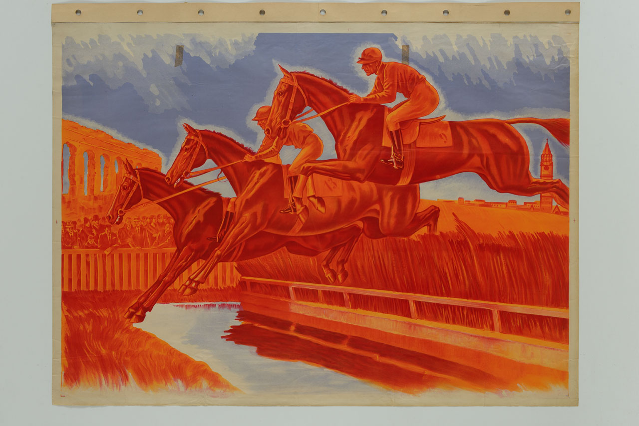 Lettura iconografica: figure maschili; fantini; cavalli; fossato; paesaggio; architetture; campanile; acquedotto; folla di spettatori. Categoria merceologica/ evento: sport; gare; ippica