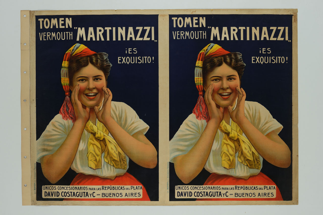 Lettura iconografica: figura femminile; gonna rossa; camicetta bianca; foulard giallo; copricapo colorato. Categoria merceologica/ tipo evento: industria alimentare; bevande; vini speciali; vermut. Nomi: Vermouth Martizzani; David Costaguta; Repubbliche del Plata; Torino Distillati srl. Luoghi: Argentina; Buenos Aires; Moncalieri; Torino