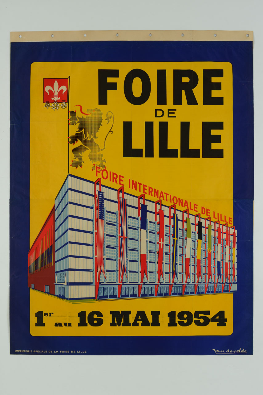 Foire In ternationale de Lille 1954. il Lille Grand Palais, dove si svolge la fiera annuale, con le bandiere internazionali degli espositori; in alto lo stemma della regione e della città francesi