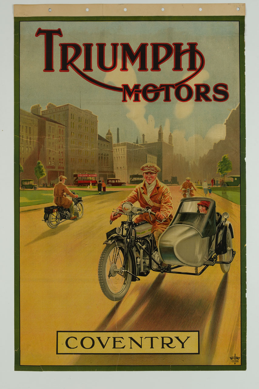 Lettura iconografica: veduta di città; architetture; palazzi; automobili; autobus; ciclomotori; side-car; figure maschili; figure femminili; alberi; strade. Categoria merceologica/ tipo evento: industria meccanica; mezzi di trasporto; motocicli; ciclomotore; side-car. Nomi: Triumph Motors; Triumph Cycle Co. Luoghi: Gran Bretagna; Inghilterra; Coventry