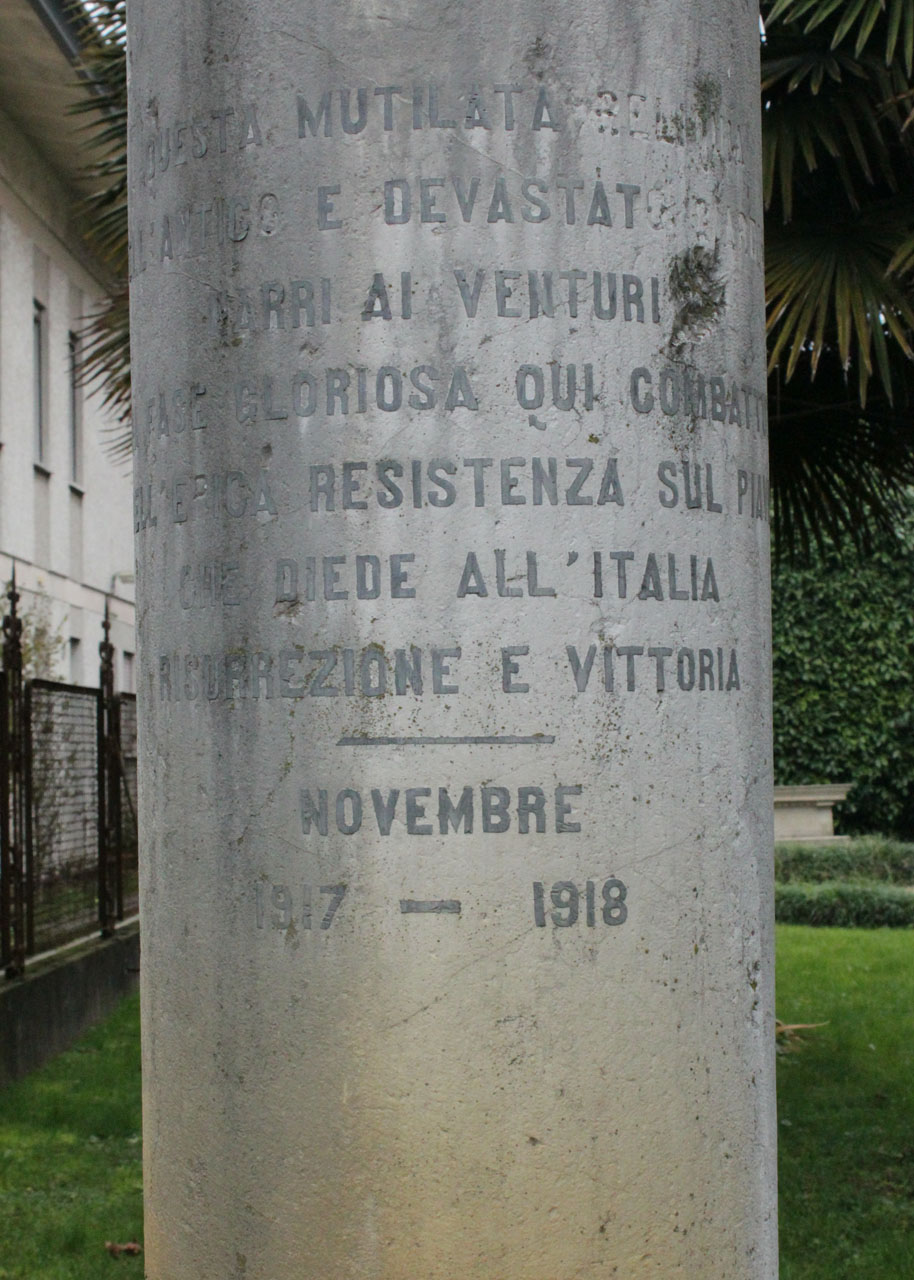 - ISCRIZIONI fusto colonna - QUESTA MUTILATA RELIQUIA/ DELL'ANTICO E DEVASTATO GIARDINO/ NARRI AI VENTURI/ UNA FASE GLORIOSA QUI COMBATTUTA/ DELL'EPICA RESISTENZA SUL PIAVE/ CHE DIEDE ALL'ITALIA/ RISURREZIONE E VITTORIA/ NOVEMBRE/ 1917 - 1918 - capitale - a caratteri applicati - italiano
