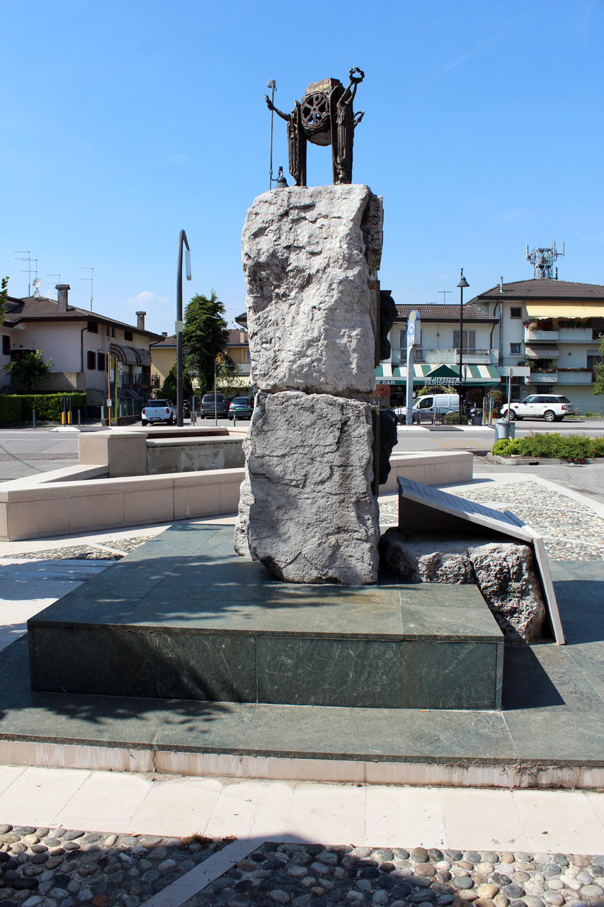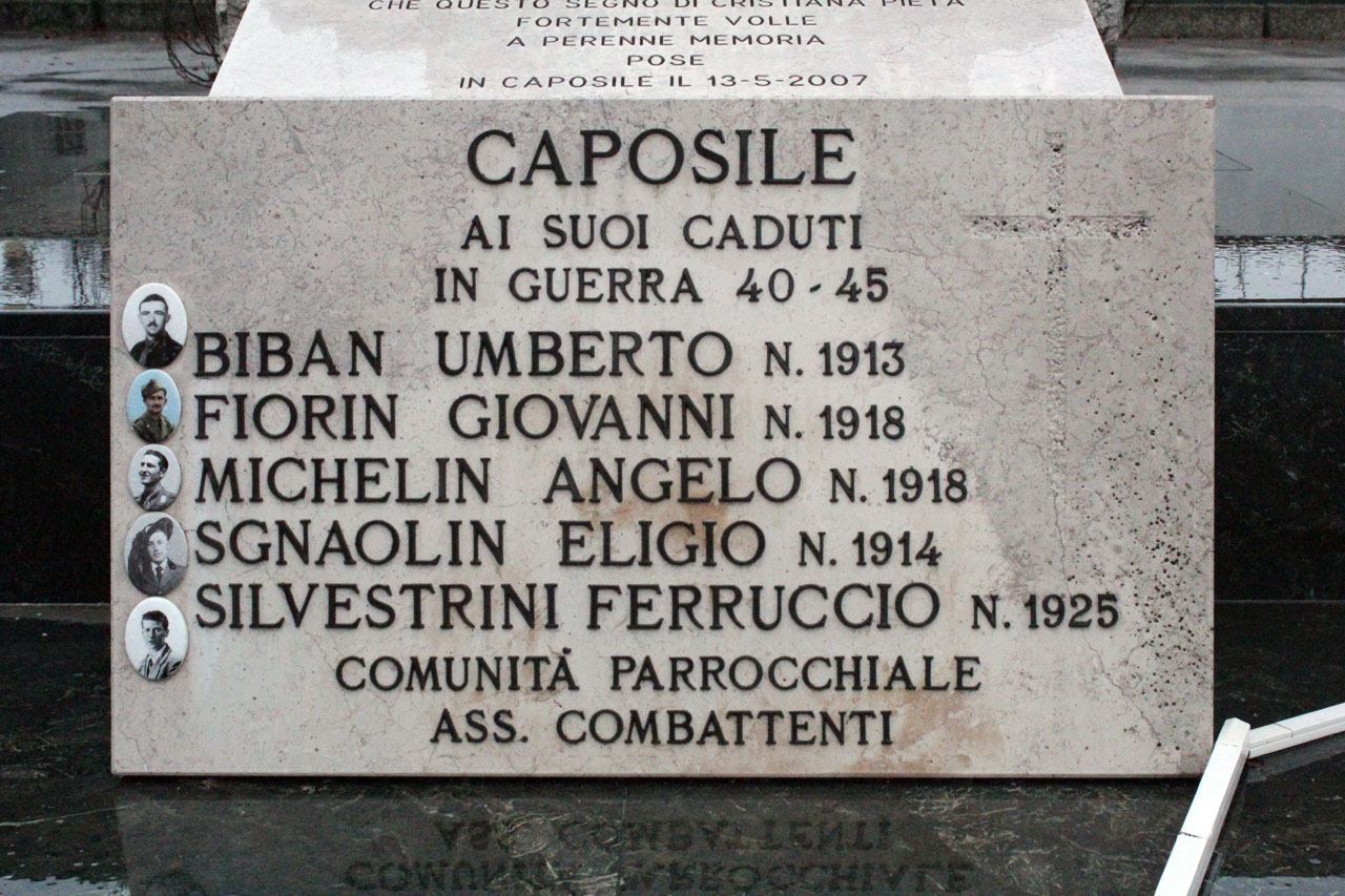 - NOTIZIE STORICO CRITICHE La lampada votiva in bronzo, simile alla lampada posta sul monumento ai caduti di Croce di Musile di Piave, proviene da uno dei monumenti del cimitero militare di Ca' Gamba a Jesolo, alla cui realizzazione aveva collaborato Gabriele D'Annunzio. In seguito alla soppressione del cimitero, avvenuta nel 1963, le salme dei caduti vennero traslate a Cittadella, mentre i monumenti furono smantellati e in parte trasferiti a Jesolo; il tripode bronzeo venne recuperato dal cav. A. Dianese, già presidente dell'Associazione Bersaglieri di San Donà di Piave, e donato a Mons. Armando Durighetto, affinchè lo ponesse sull'erigendo monumento di Caposile (E. Bergamo, "Storia di un prete, per i 90 anni di don Armando Durighetto da Zero Branco", Venezia 2001, pp. 149-150; L. Bincoletto, L. Smaniotto, "Il fronte a casa nostra", Musile di Piave 2008, p. 96). Il monumento è realizzato su progetto dell'arch. Omero Sirch; i tre rilievi in bronzo, che riportano la data 1974, sono opera di O. Peretti e sono stati fusi presso la Fonderia Artistica Stefan s.a.r.s. Originariamente ruotato verso il fronte strada, il monumento è visibile nella sua collocazione precedente alla risistemazione della piazza -avvenuta nel 2004, con l'inserimento di una fontana, su progetto del geom. G. Pavan- in una foto storica pubblicata in: L. Bincoletto, L. Smaniotto, "C'era una volta Musile", Musile di Piave 2007, p. 96. Il monumento è citato in: Associazione Nazionale Combattenti e Reduci. Federazione Provinciale di Venezia, "Un libro per non dimenticare", Venezia 2006, p. 234