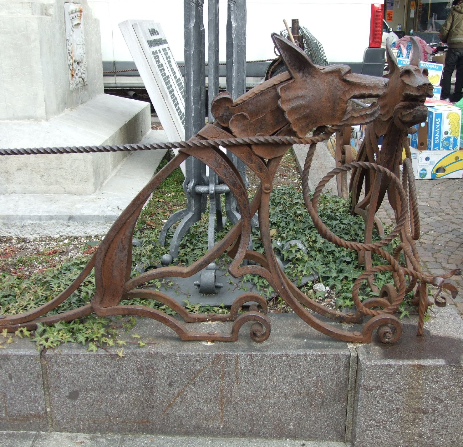Un semplice basamento posto su un unico gradino sostiene il bel gruppo scultoreo in marmo. Raffigura un soldato morente, che tiene ancora tra le mani il coltello e con il braccio sinistro sostiene la bandiera, ma si accascia tra le braccia di una figura femminile dolente. La cancellata in ferro battuto è particolarmente interessante, mostra in due angoli coppie di lupi stilizzati posti in maniera speculare, mentre gli altri due erano costituiti da fasci littori, modificati in tempi più recenti con l'eliminazione dell'ascia