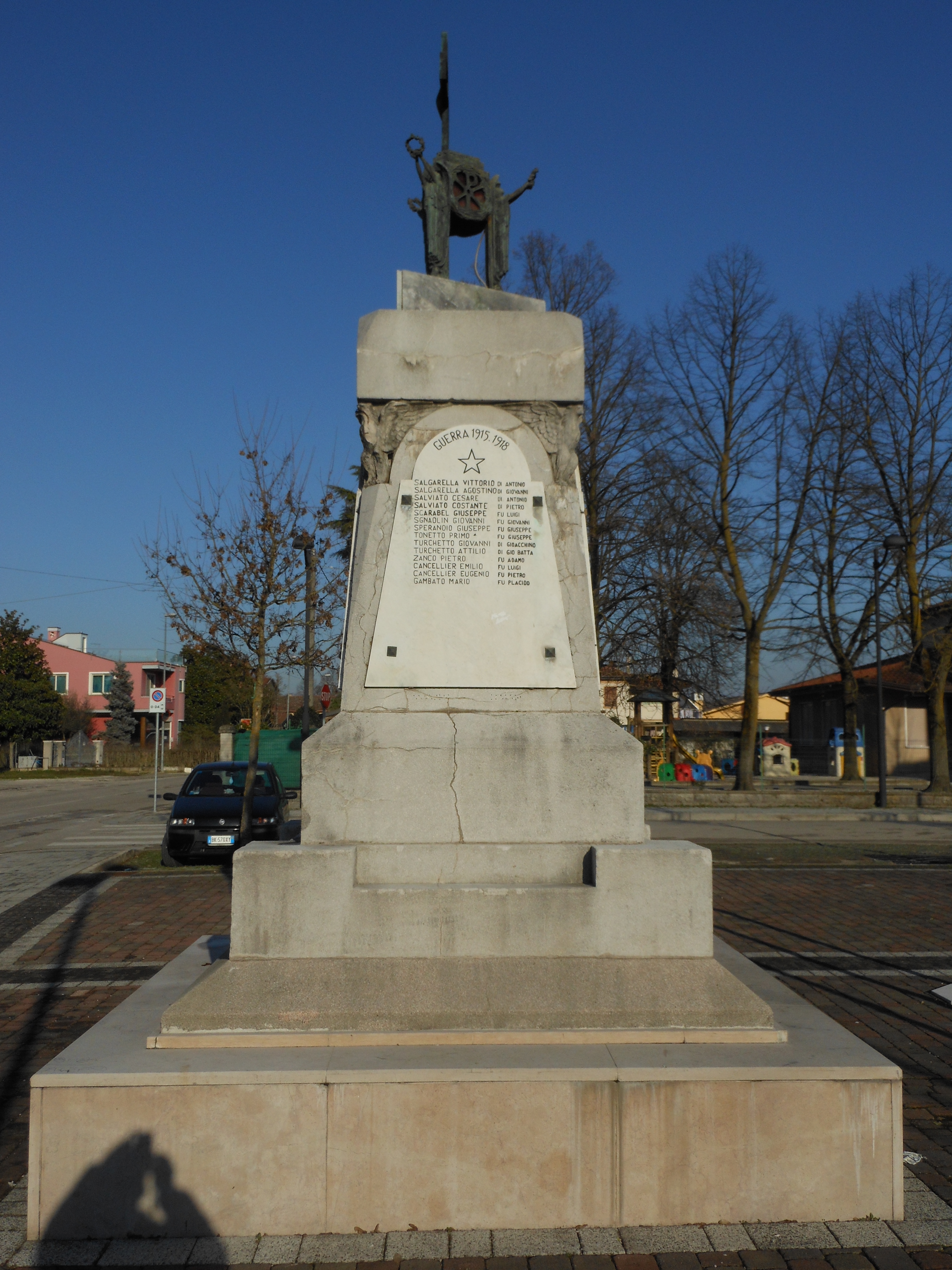 - NOTIZIE STORICO CRITICHE L'opera in esame fu inaugurata il 2 ottobre 1927 al centro del Prà delle Oche alla presenza delle maggiori autorità cittadine che tributarono il loro consenso e plauso all'opera voluta dal "Comitato pro monumento" di Croce e Musile. In origine, al posto della lampada votiva, c'era una statua bronzea rappresentante un soldato ("il fante") nell'atto di combattere, realizzata da Vasco Viaro di Mogliano Veneto e fusa dalla fonderia Possamai di Solighetto, che fu rimosso all'inizio della Seconda Guerra Mondiale per utilizzare il metallo a fini bellici. Quando alcuni anni dopo fu dismesso il Cimitero Militare di Croce, furono recuperate dal Monumento ai Caduti lì presente sia la lampada votiva sia una croce parietale - entrambe in bronzo - e collocate in quello al centro del paese rimasto senza soldato, con la croce saldata sopra la lampada votiva per dare un minimo di volume a una "statua di recupero" che avrebbe dovuto sostituire quella asportata (troppo costoso far fondere un altro Fante). Con la costruzione delle case popolari nel 1951, Prà delle Oche, nel frattempo diventato "Piazza Tito Acerbo", fu ridotto della metà e il monumento venne a trovarsi non più al centro della vecchia grande piazza ma in un'area laterale della nuova piazza dimezzata. Fu solo in seguito al recente restauro della piazza (2002) che il monumento venne spostato centralmente di fronte alla ex scuola, oggi centro delle associazioni "Lisa Davanzo" (vedi Carlo Dariol, "Storia di Croce" volume 2, "Don Nadal, el pàroco de Crose")