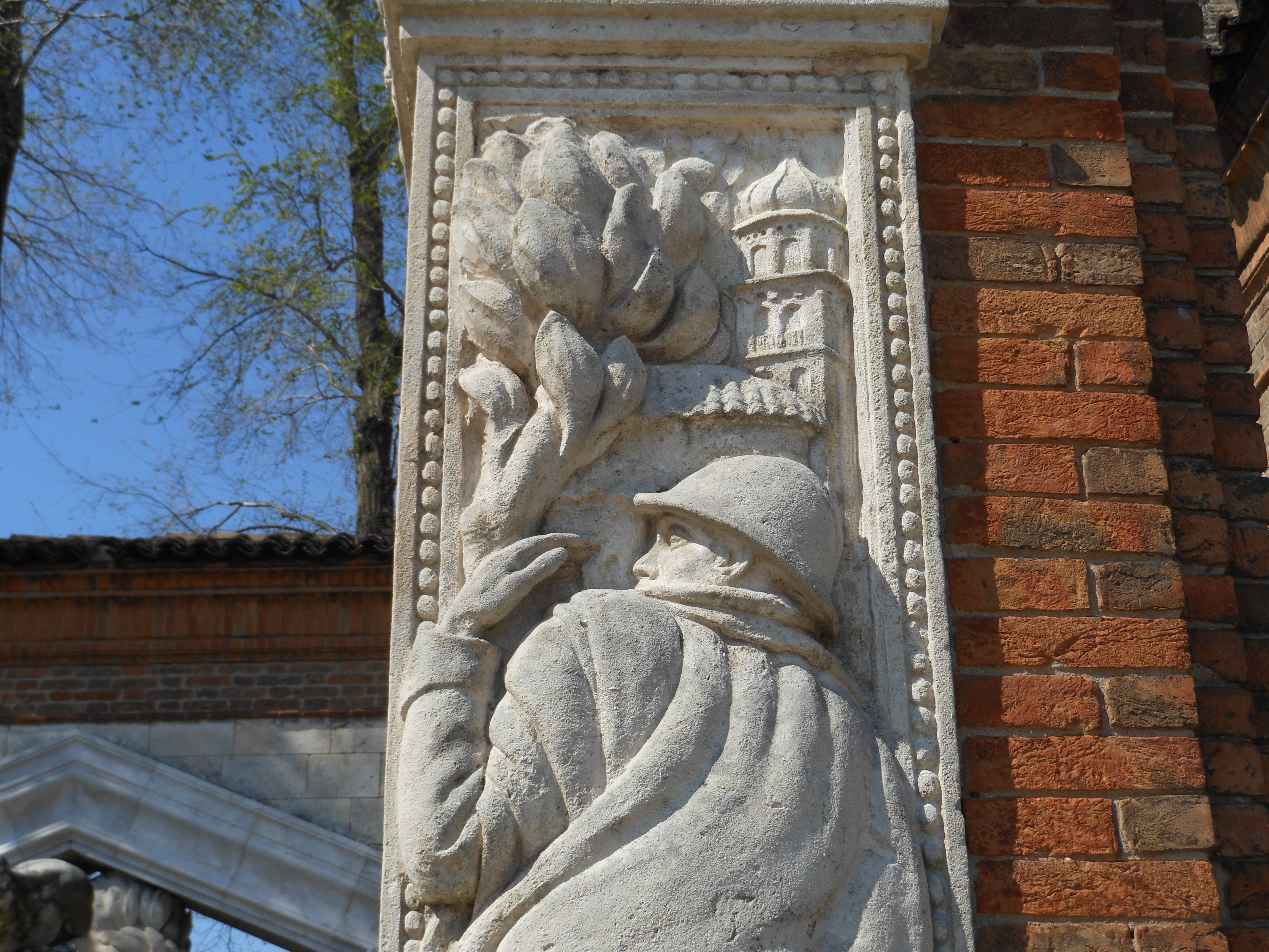 Altorilievo con cornice sagomata posto sulla prima colonna di sinistra del monumento, rappresentante l'ultimo saluto del soldato a sua moglie e a suo figlio
