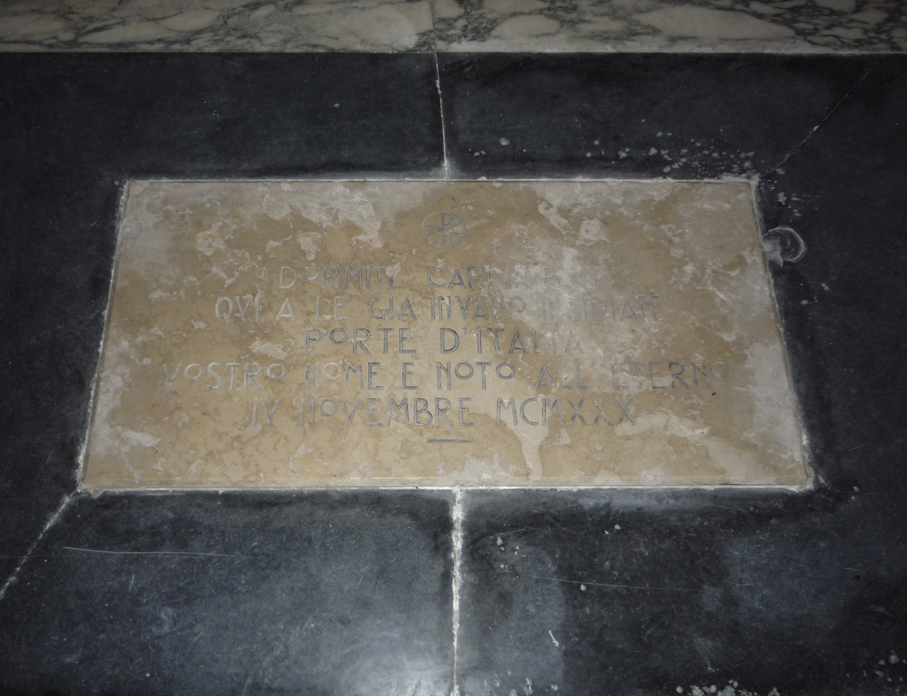 - ISCRIZIONI centrata - DORMITE CARI IN PACE / QVI ALLE GIA’ INVANO INSIDIATE / PORTE D’ITALIA / IL VOSTRO NOME E’ NOTO ALL’ETERNO / IV NOVEMBRE MCMXXX - lettere capitali e numeri romani -