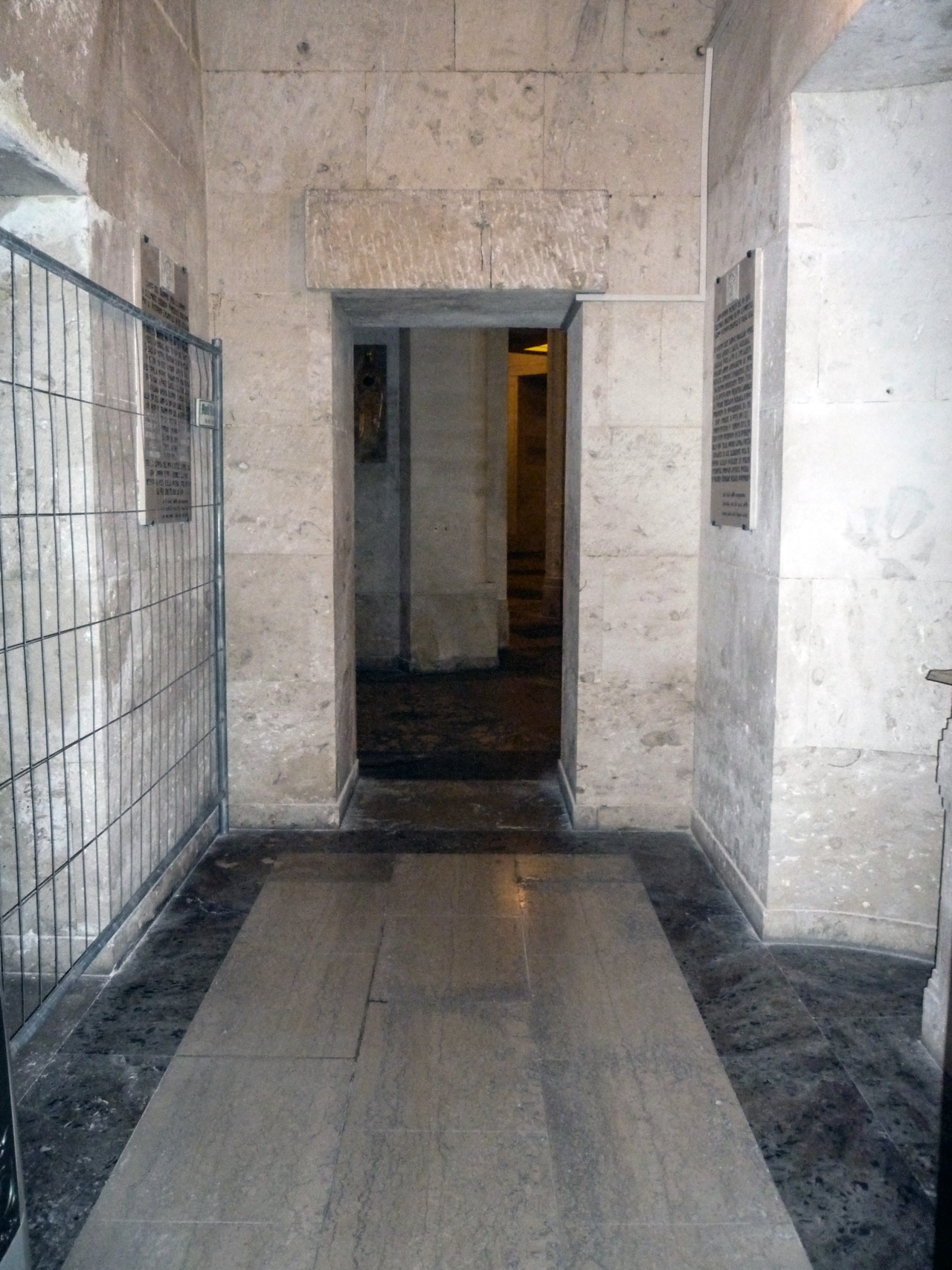 - ISCRIZIONI centrata - ANNO DOMINI MCMXXV DIE VI IDVS / DECEMBRIS INDICTIONE VIII PIO XI PONTIFICE / MAXIMO VICTORIO EMANVELE III ITALIAE REGE. / IN FAVSTVM TANTI TAMQVE PRAECLARI OPERIS / OMEN LAPIDEM E SANCTA VATICANAE / BASILICAE PORTA A PIO XI, CVM SACRVM / IVBILAREM ANNVM AVSPICARETVR, DE MORE / PATEFACTA, SIMVLQVE LVPARDIENIS SPECVS / FRAGMENTVM EMINENTISSIMVS PETRVS TITVLI / SS. XII APOSTOLORVM PRESBYTER CARDINALIS / LA FONTAINE VENETIARVM PATRIARCA IN NOVO / FONDAMENTO PIE PROVIDENTERQVE SVA IPSE / MANV CONDIDIT. IN VOTIS HOC EST / OMNIVM NOSTRVM, VT TEMPVM, ISTVD, VBI / ETIAM CIVIVM NOSTRORVM QVI IN NVPERRIMO / BELLO PRO ITALICI NOMINIS GLORIA FORTITER / DIMICANTES IN ACIE CECIDERVNT, OSSA IN / PROPRIO SACELLO QVIESCENT, SIT PERENNI / INTERRVPTAE NVNQVAM CIVITATIS NOSTRAE / IN VIRGINEM DEIPARAM PIETATIS MONVMENTO. / DAL TESTO DELLA PERGAMENA / TUMULATA CON LA POSA DELLA / PRIMA PIETRA DEL TEMPIO VOTIVO - stampatello, corsivo e numeri romani - a incisione - latino