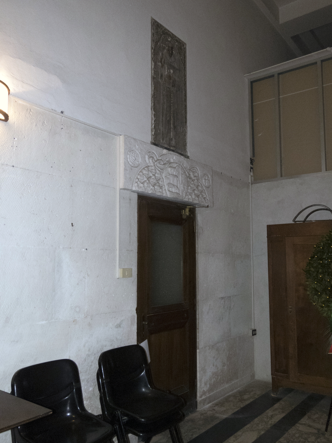 - STEMMI centrale nella lastra - cardinalizio - Stemma - La Fontaine - sinistrato: al primo agnello nimbato con il monogramma di Cristo soprastante un monte dal quale sgorgano quattro fiumi ai quali si abbeverano due agnelli: al secondo tre gigli caricati da una stella cometa a sei punte. Cimato da cappello con due cordoni laterali, con i fiocchi in numero di trenta, quindici per lato, su cinque file, 1, 2, 3, 4, 5 e croce doppia posta in palo