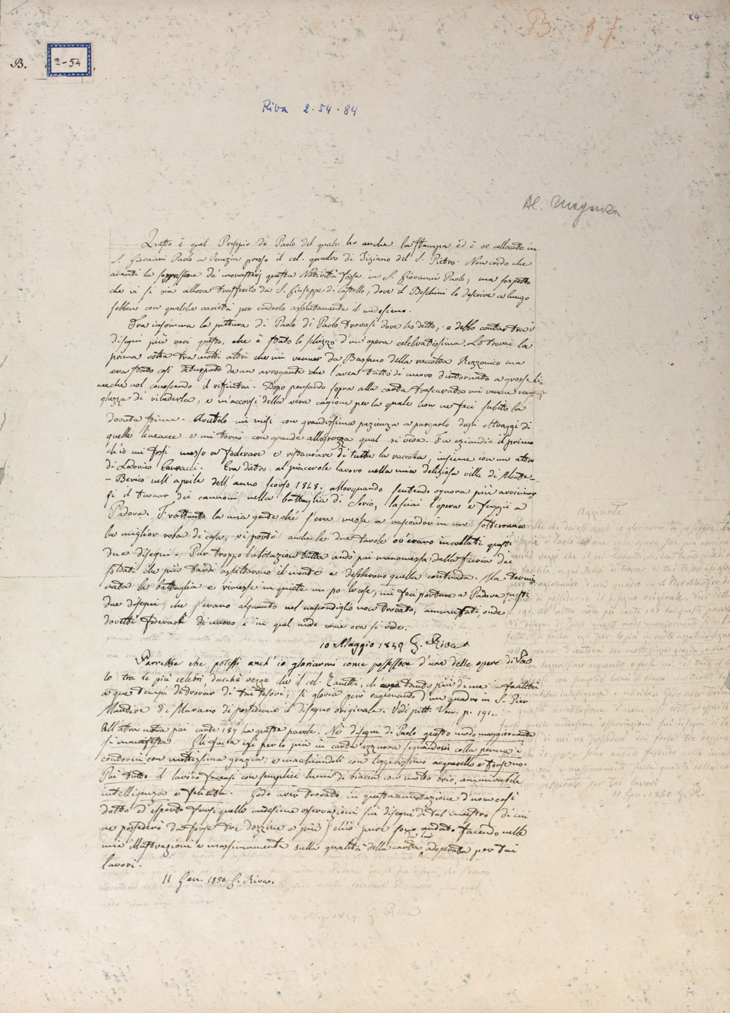 - ISCRIZIONI retro del cartone - Questo è quel Presepio di Paolo del quale ho anche la stampa ed è or collocato in S. Giovanni Paolo a Venezia presso il cel. quadro di Tiziano del S. Pietro. Non credo che avanti la soppressione de' monasterj questa Natività fosse in S. Giovanni Paolo; ma sospetto che vi si sia allora trasferito da S. Giuseppe di Castello, dove il Boschini lo descrive a lungo sebben con qualche varietà per crederlo assolutamente il medesimo. Tra insomma la pittura di Paolo di Paolo trovasi dove ho detto, e debbo contar tra i disegni più rari questo, che è stato lo schizzo d'un opera celebratissima. Lo trovai la prima volta tra molti altri che mi venner da Bassano della raccolta Rezzonico ma era stato così deturpato da un arrogante che l'avea tutto di nuovo dintornato a grosse linee che nol conoscendo il rifiutai. Dopo pensando sopra alla carta trascurata mi venne vaghezza di rivederla, e m'accorsi della vera cagion per la quale non ne feci subito la dovuta stima. Avutolo mi misi con grandissima pazienza a purgarlo degli oltraggi di quelle lineacce e mi tornò con grande allegrezza qual si vede. Fu eziandio il primo ch'io mi fossi messo a foderare e ristaurare di tutta la raccolta, insieme con un altro di Lodovico Carracci. Era dietro al piacevole lavoro nella mia deliziosa villa di Monte Berico nell'aprile dell'anno scorso 1848. allor quando sentendo ognora più avvicinarsi il tuonar dei cannoni nella battaglia di Sorio, lasciai l'opera e fuggii a Padova. Frattanto la mia gente che s'era messa a nasconder in un sotterraneo la miglior roba di casa, vi portò anche le due tavole ov'erano incollati questi due disegni. Pur troppo l'abitazione tutta andò poi manomessa dalla furia dei soldati che più tardi assaltarono il mondo e desolarono quella contrada. Ma terminata la battaglia e rimesse in quiete un po' le cose, mi feci portare a Padova questi due disegni, che s'erano alquanto nel nascondiglio non trovato, ammuffati, onde dovetti foderarli di nuovo e in quel modo come ora si vede. 10 Maggio 1849 G. Riva// Parrebbe che potessi anch'io gloriarmi come possessore d'una delle opere di Paolo tra le più celebri, dacchè veggo che il cel. Zanetti, ch'avea tanto più di me facilità a que tempi - Giuseppe Riva - corsivo -