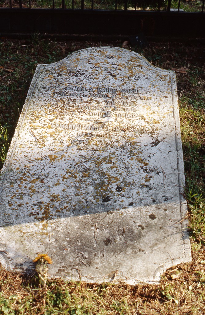 Lapide rettangolare centinata terminate a volute. Nella parte inferiore presenta agli angoli due rientranze. La lapide risulta distesa. Lo specchio epigrafico è bordato da una linea perimetrale continua