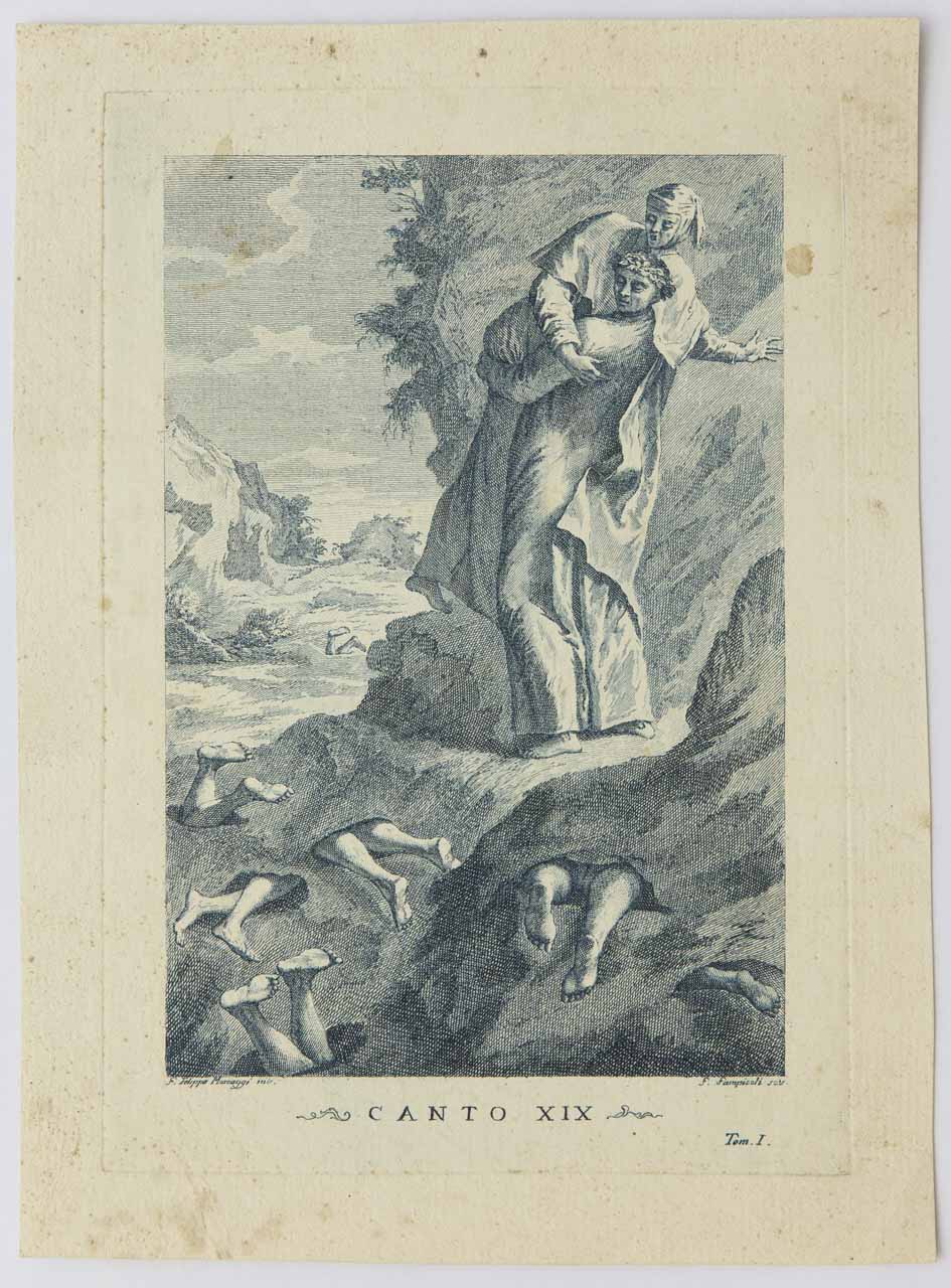 • NOTIZIE STORICO CRITICHE Questa incisione appartiene al gruppo di 34 tavole illustrative incise da Giuliano Giampiccoli per l'opera "La Divina Commedia di Dante Alighieri con varie annotazioni e copiosi rami adornata. Dedicata alla Sacra Imperial Maestà di Elisabetta Petrowna, Imperatrice di tutte le Russie, dal conte don Cristoforo Zapata de Cisneros ", edita da Antonio Zatta tra 1757 e 1758 in cinque volumi, a Venezia. L'incisore bellunese collaborò a diversi progetti di illustrazione libraria, traducendo su rame i disegni di vari autori. Luigi Alpago Novello precisa per ogni tavola incisa da Giampiccoli l'esatta collocazione all'interno delle cantiche dantesche, ricordando, inoltre, come esse si potessero trovare inserite in rari album dove "ogni foglio ha due incisioni disposte traversalmente, con nel mezzo l'Argomento, ed ogni incisione è in media di mm. 216x137" (Alpago-Novello 1940, p. 498). La stampa in oggetto deriva da una invenzione di Filippo Marcaggi e doveva illustrare il canto XIX dell'Inferno, nel quale Dante e Virgilio raggiungono il cerchio dei simoniaci, conficcati a testa in giù nel terreno. Tenendo conto del 1758 come data di pubblicazione da parte di Zatta dell'opera integrale, è presumibile che Giampiccoli abbia lavorato a questa commissione intorno alla metà del secolo, nel pieno della propria maturità artistica