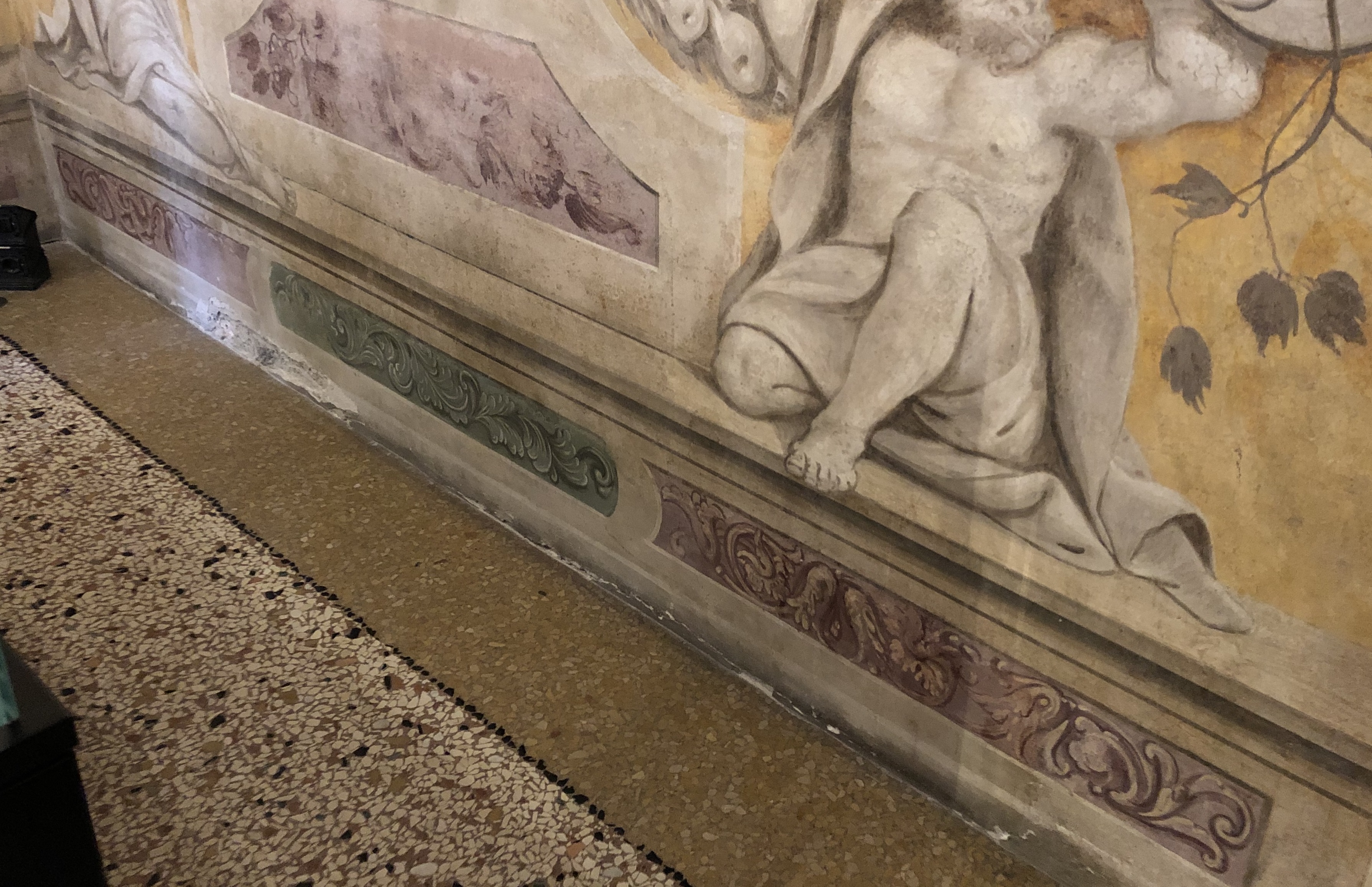 Fregio composto da più riquadri colorati alternati verdi e viola, con motivi fitomorfi all'interno