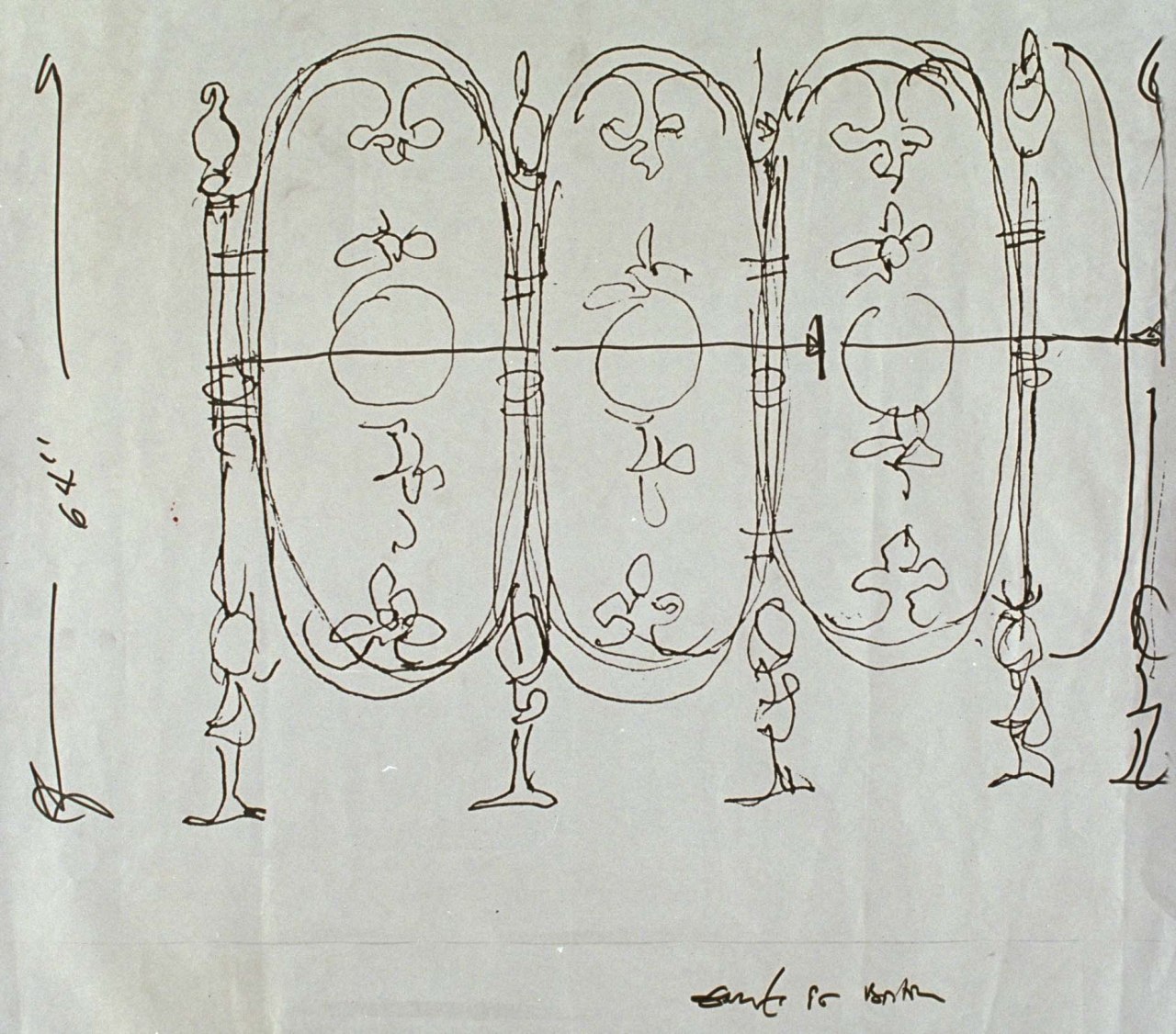Disegno eseguito a pennarello su foglio di carta bianca. Studio di un separé per scenografia teatrale