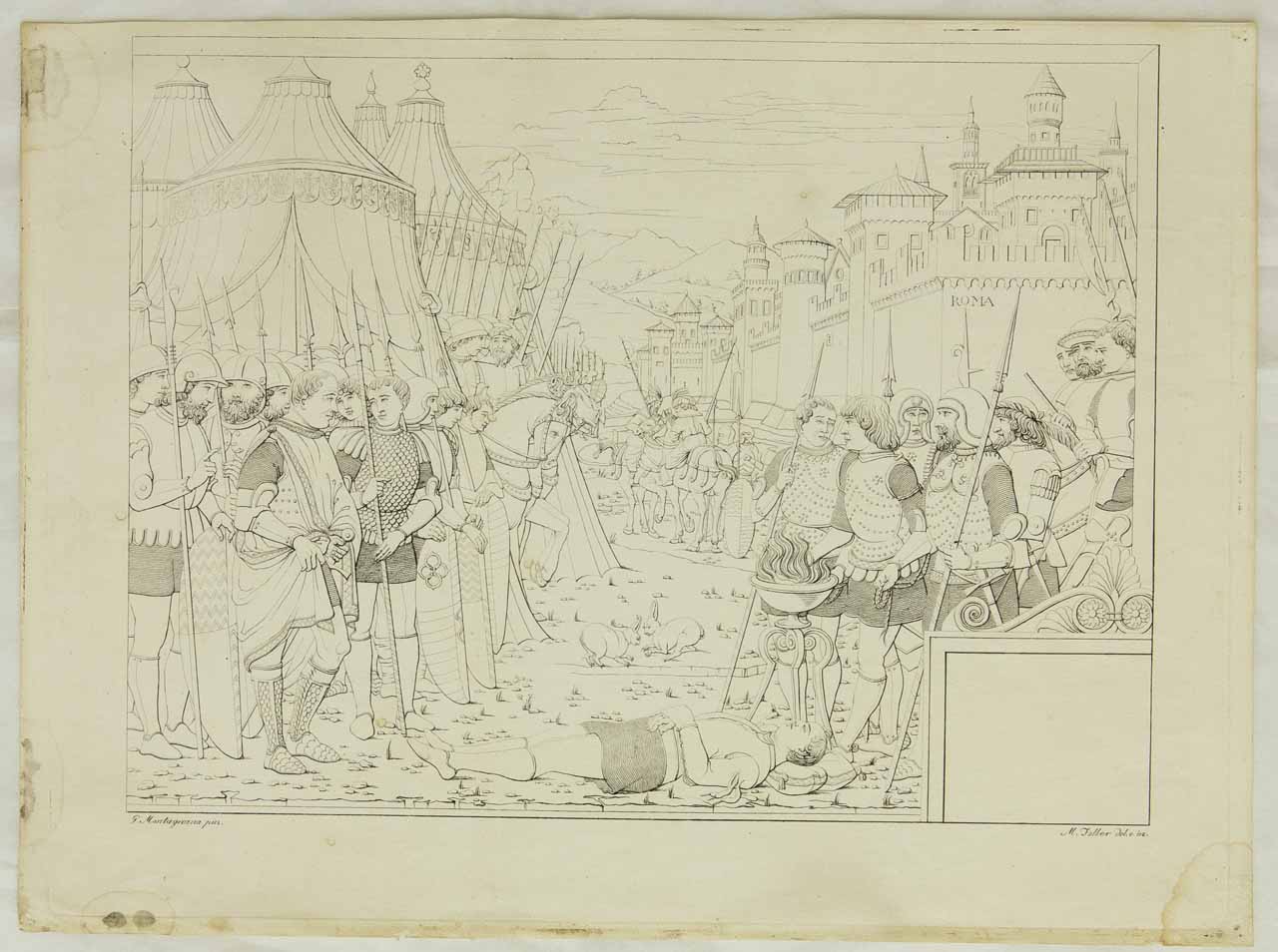 - NOTIZIE STORICO CRITICHE La stampa riproduce uno degli affreschi della Sala dei Nobili del Palazzo della Comunità di Belluno, noto anche con il nome di Caminata. L'ambiente venne decorato attorno al 1490 da J. Parisati da Montagnana, con cinque scene di storia romana: Il combattimento tra Orazi e Curiazi, Il ritorno dell'Orazio vincitore, Orazio trionfante uccide la sorella, Muzio Scevola uccide per errore il segretario di Porsenna, Muzio Scevola davanti a Porsenna. Come nel caso degli affreschi di P. Amalteo che decoravano la Sala interna, anche queste pitture andarono perdute con la demolizione della Caminata nel 1838, per lasciar spazio al nuovo Municipio di Belluno. Prima della distruzione, di queste pitture vennero tratte delle stampe da parte di M. Toller, alcune delle quali si conservano nel Fondo Alpago-Novello (MCBL 10678-10690). Presso il Museo Civico di Belluno, oltre a molti esemplari delle incisioni del Toller (MCBL 1241-1260), si conservano anche numerosi lacerti degli affreschi della Caminata, sia di quelli del Parisati, che dell'Amalteo (MCBL 553-572, 629-634)