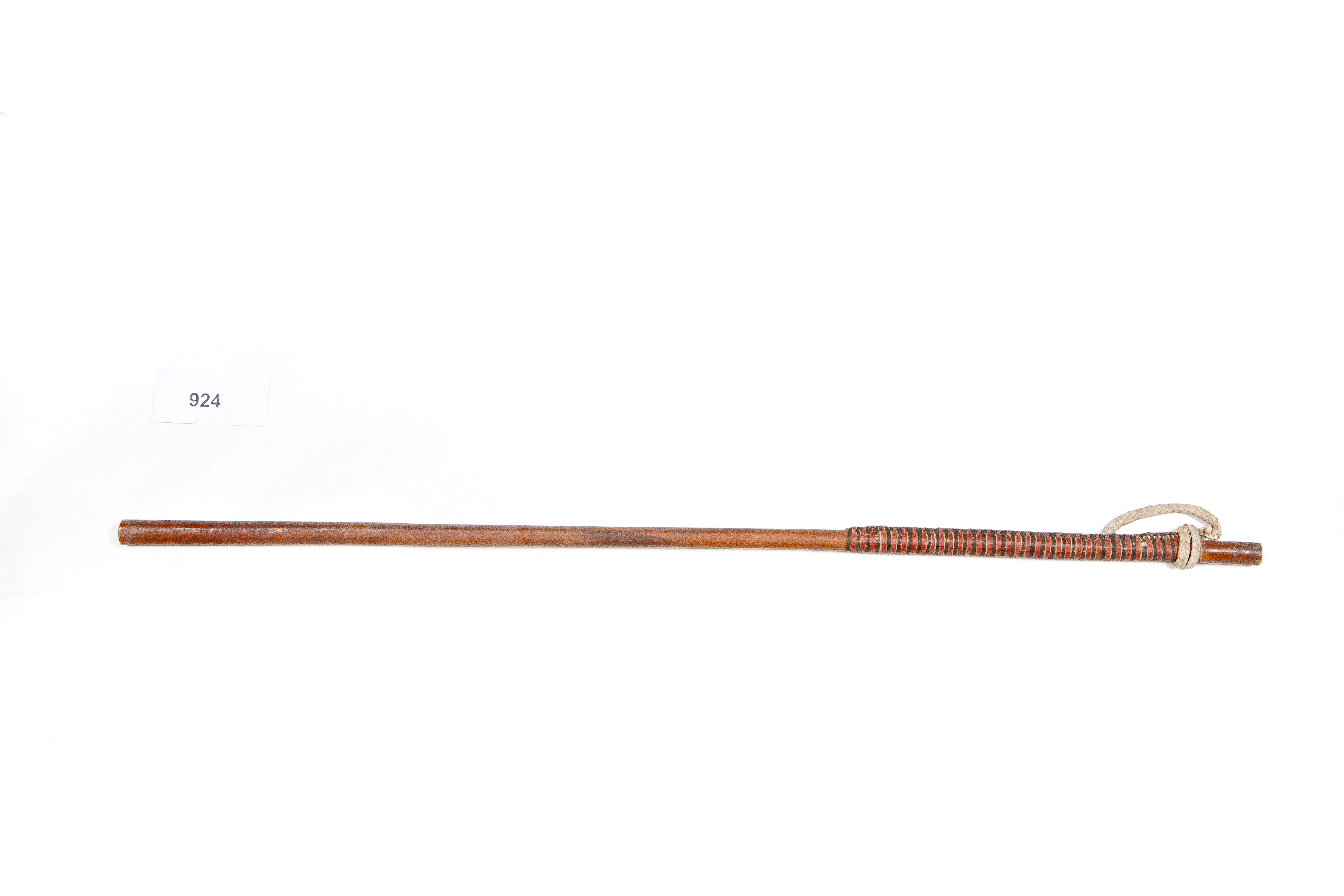 Bastone in legno con impugnatura decorata da strisce di pelle intrecciate e colorate in rosso e nero